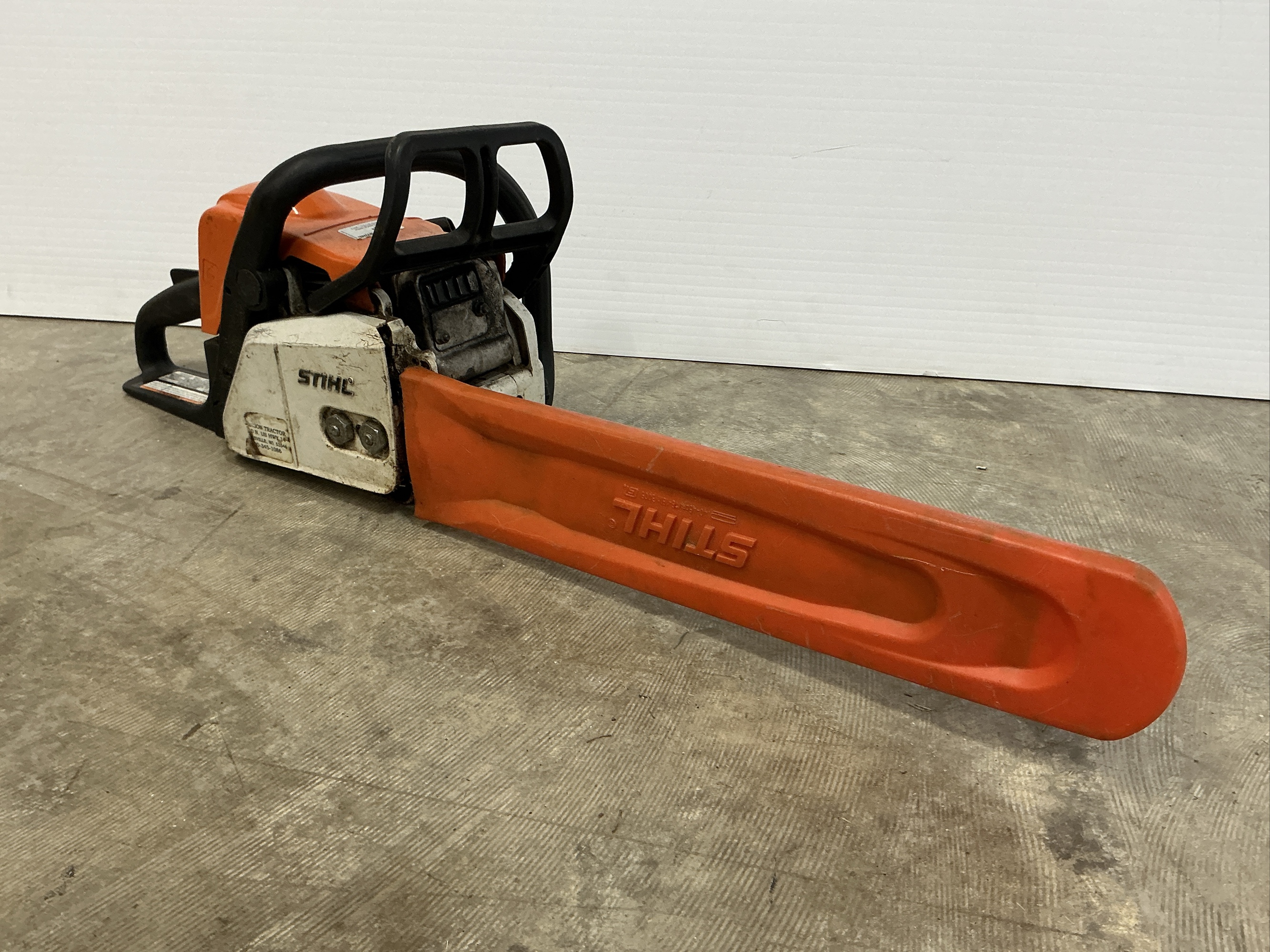 This listing is for a Stihl MS170 chainsaw. It is orange and white in color with a black handle. The bar is a ROLLOMATIC E Mini. It says Stihl on the side of the unit and on the bar.