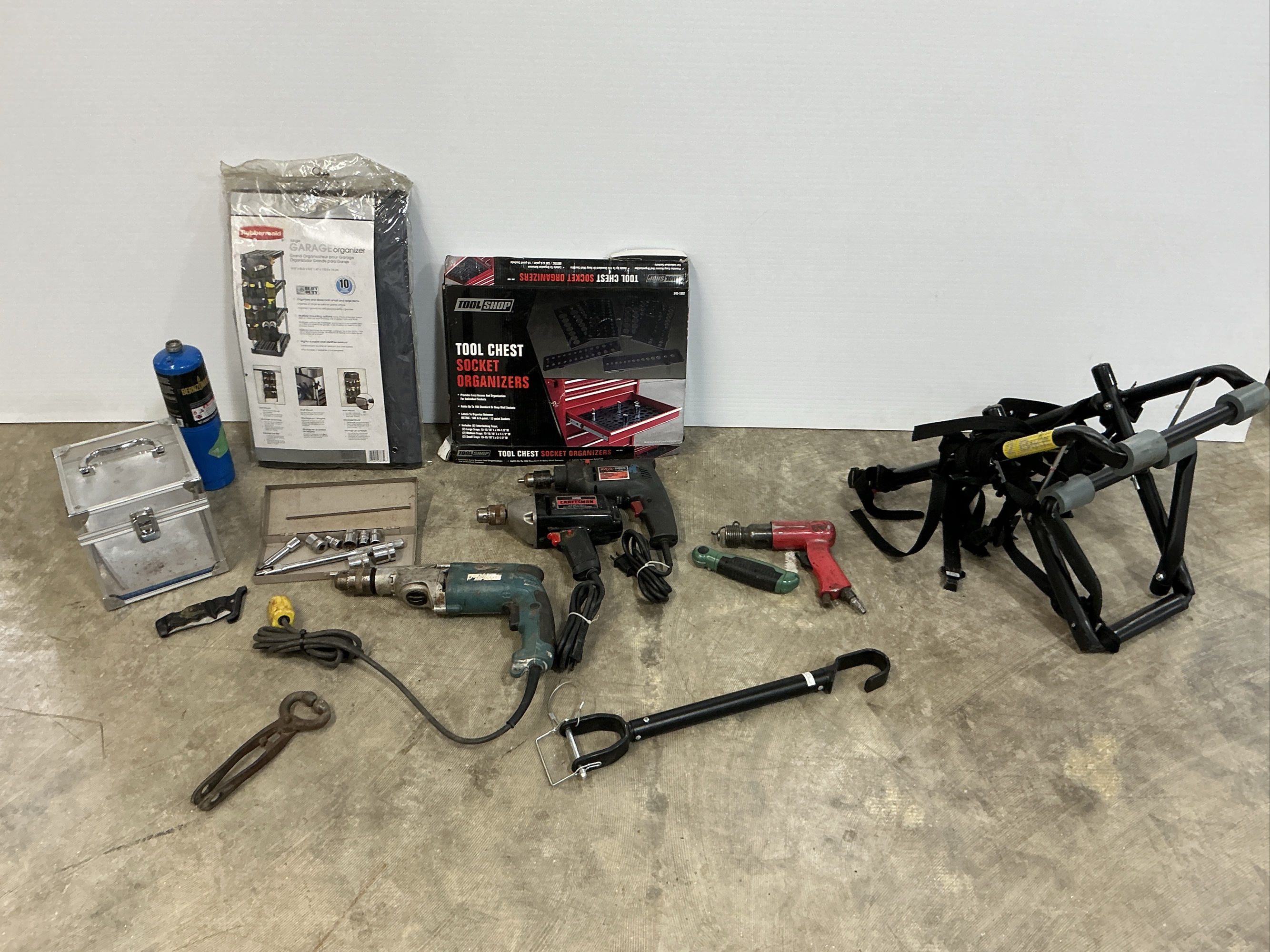 Collection of tools and organization items including: drills, Tool Shop socket organizers, a Rubbermaid garage organizer, a bicycle carrier, and other assorted tools.