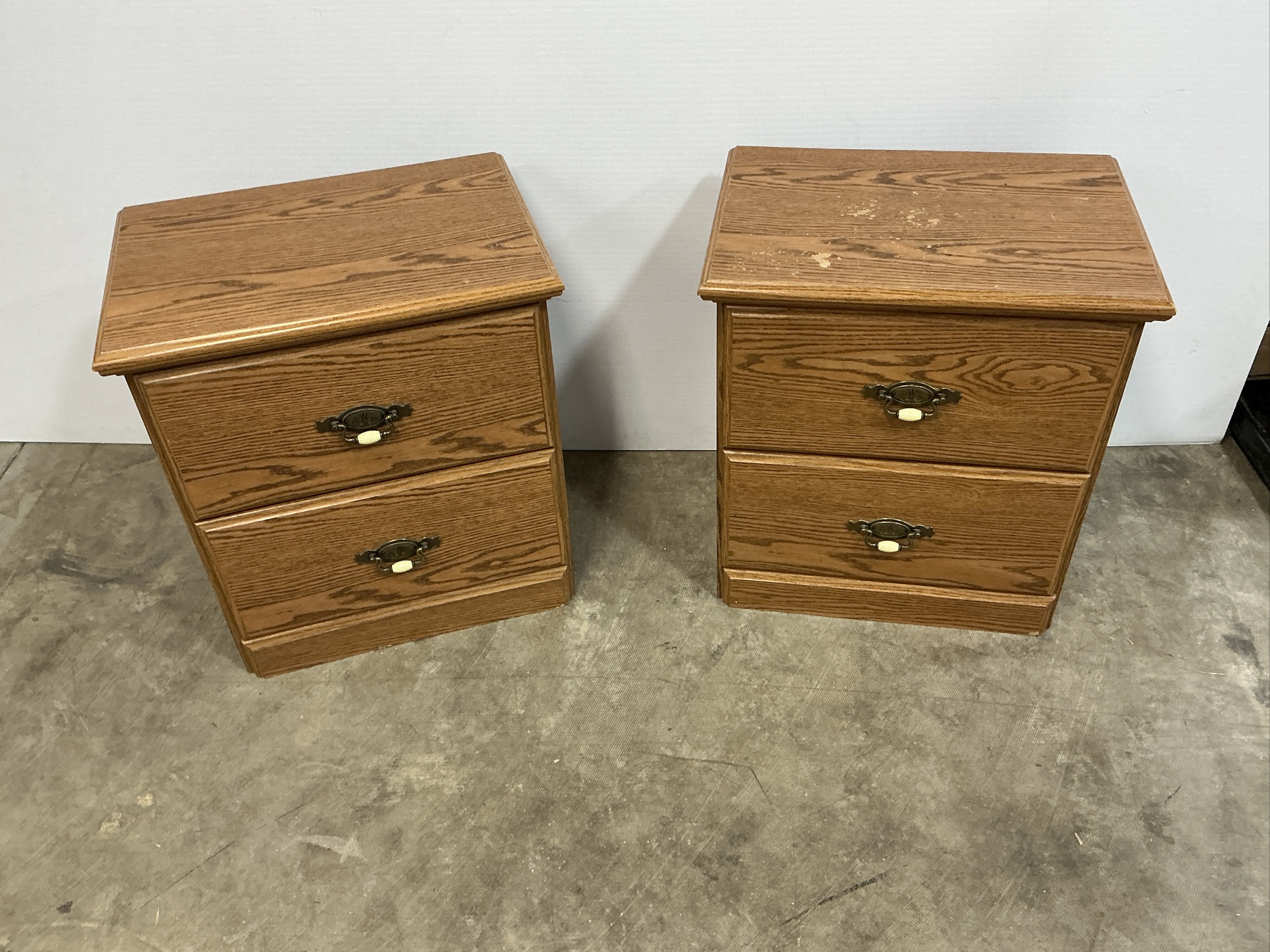 Two wood nightstands, each with two drawers and decorative hardware. 24 x 21 x 16 in.