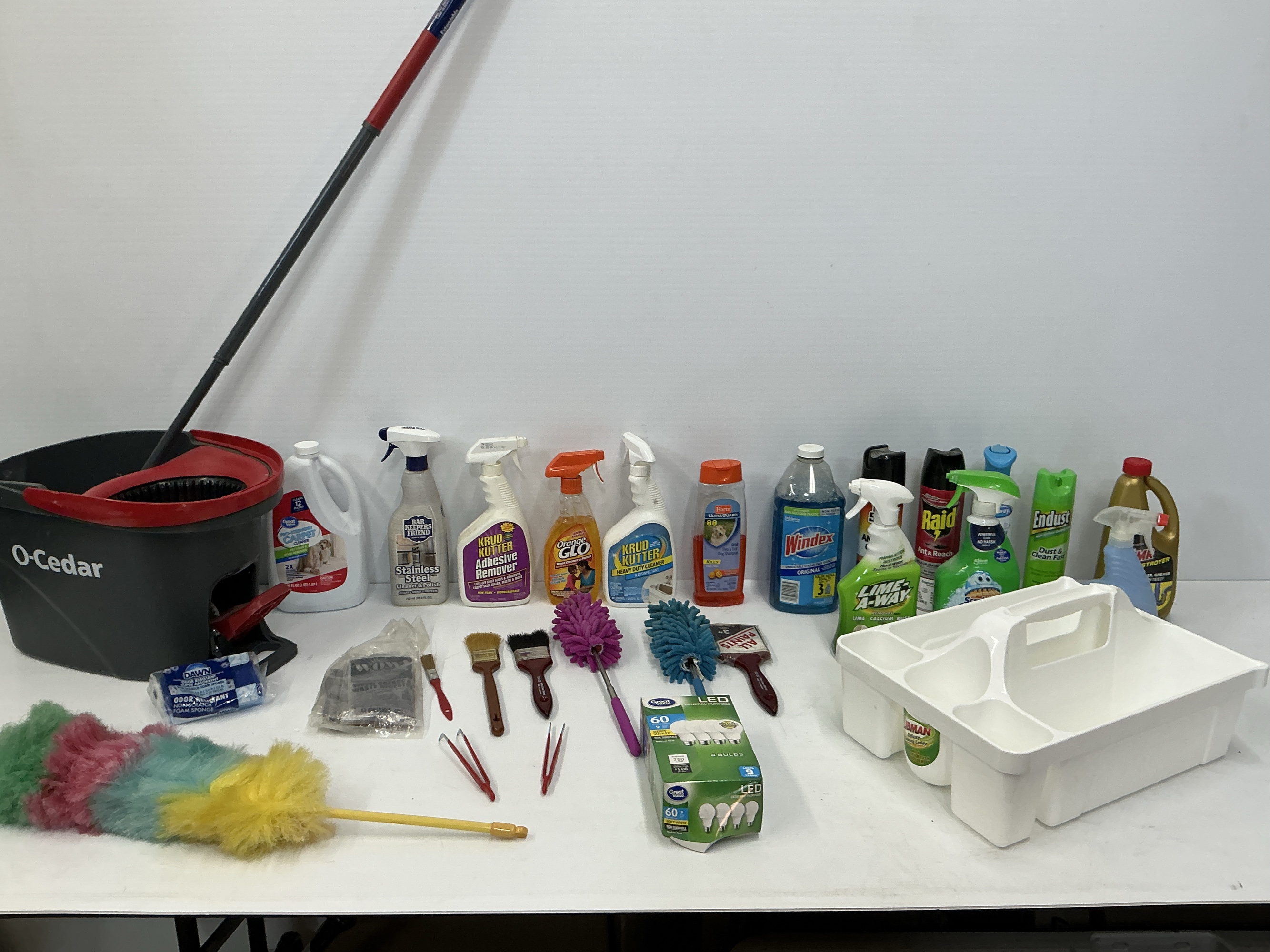 This lot includes a variety of cleaning supplies such as spray cleaners, duster, mop, organizer and more. See photos for details.