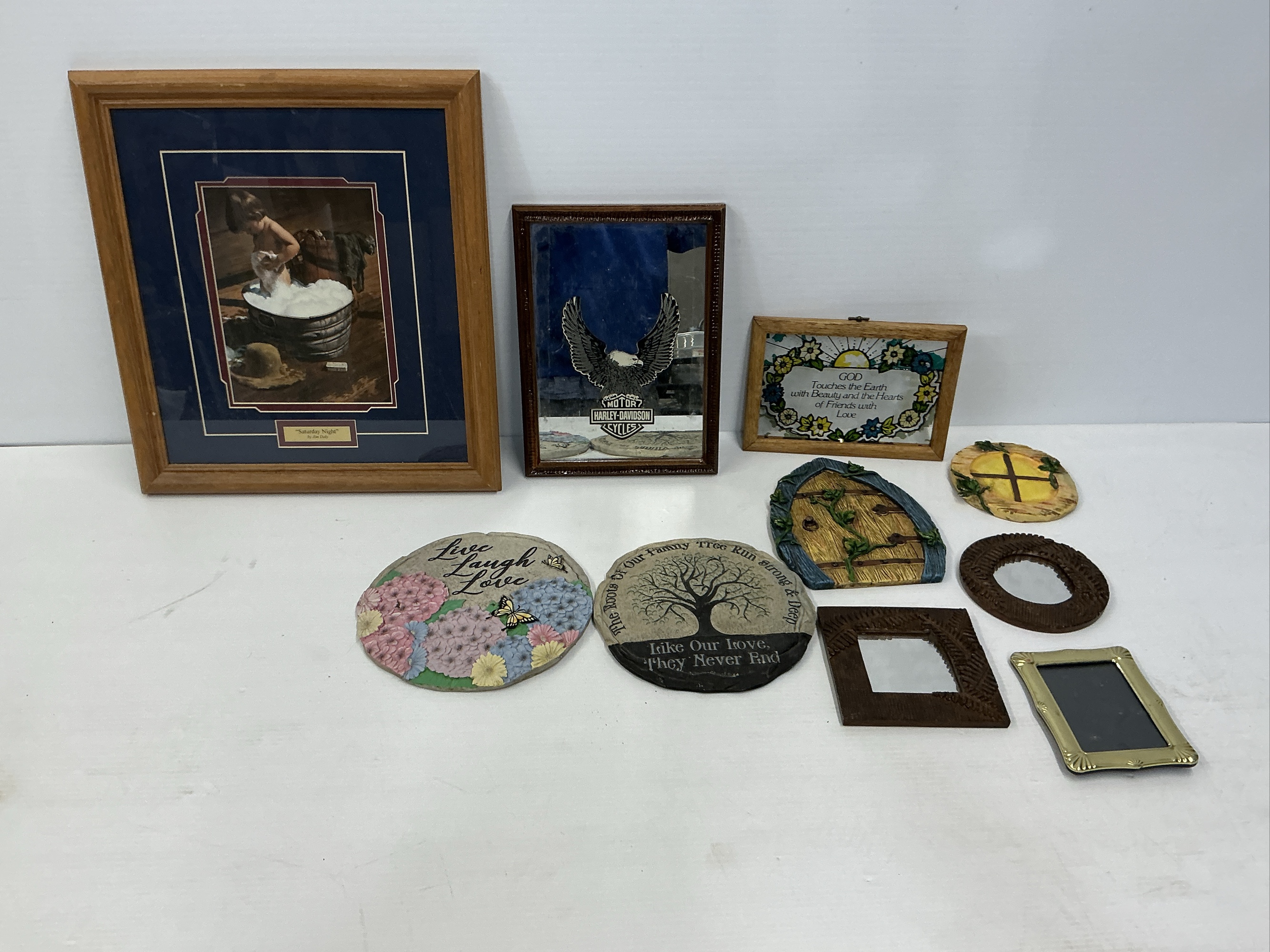 This auction features a variety of decorative items, including framed prints and various home accents. The lot includes wall art, photo frames, a Harley-Davidson mirror, inspirational stones, and assorted small decor pieces.