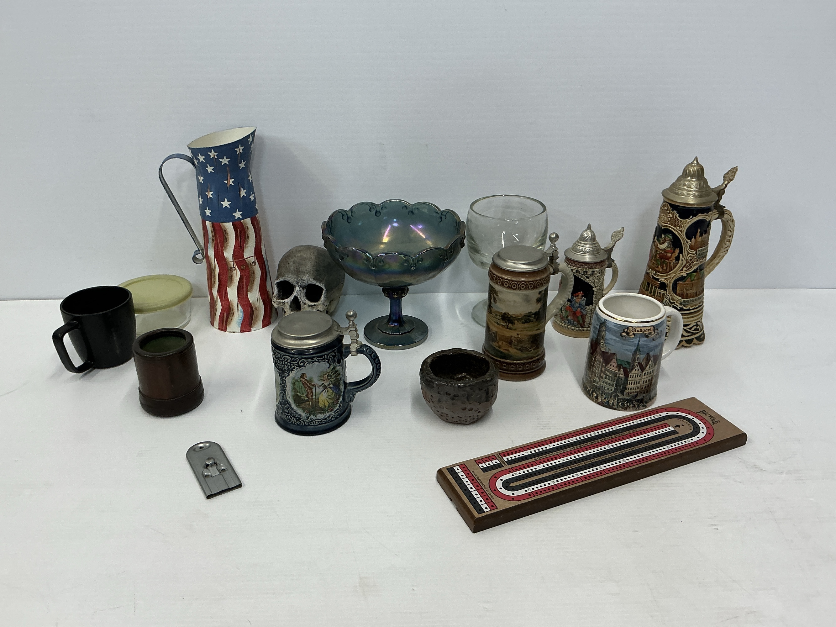 A diverse collection of items, featuring decorative beer steins, various drinking glasses, and a wooden cribbage board. Additional items include a skull, a carnival glass compote, and a flag-themed pitcher.