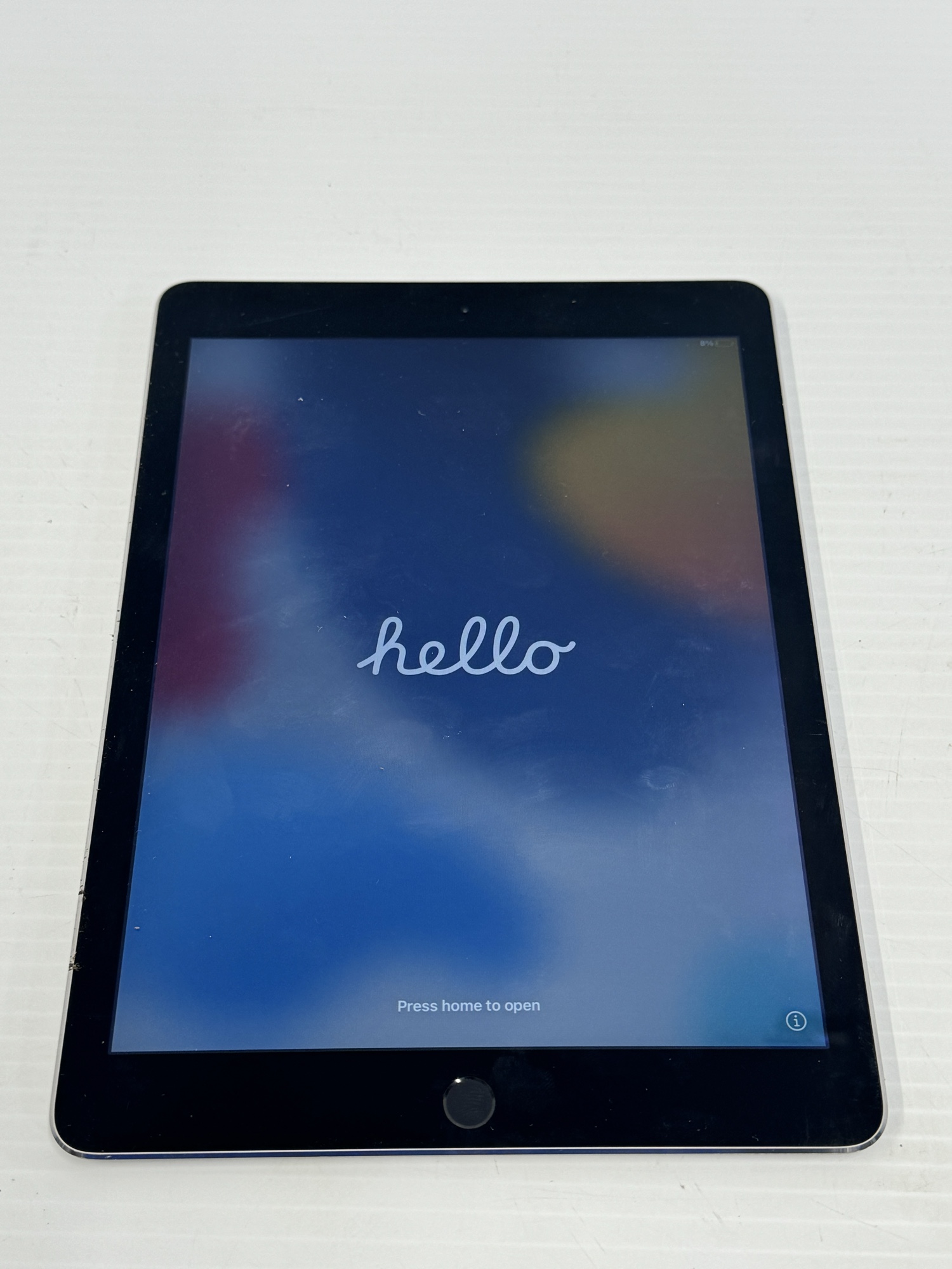Apple iPad Model A1566, with a gray finish. Designed by Apple in California. Serial number DMQP31F0G5VJ.