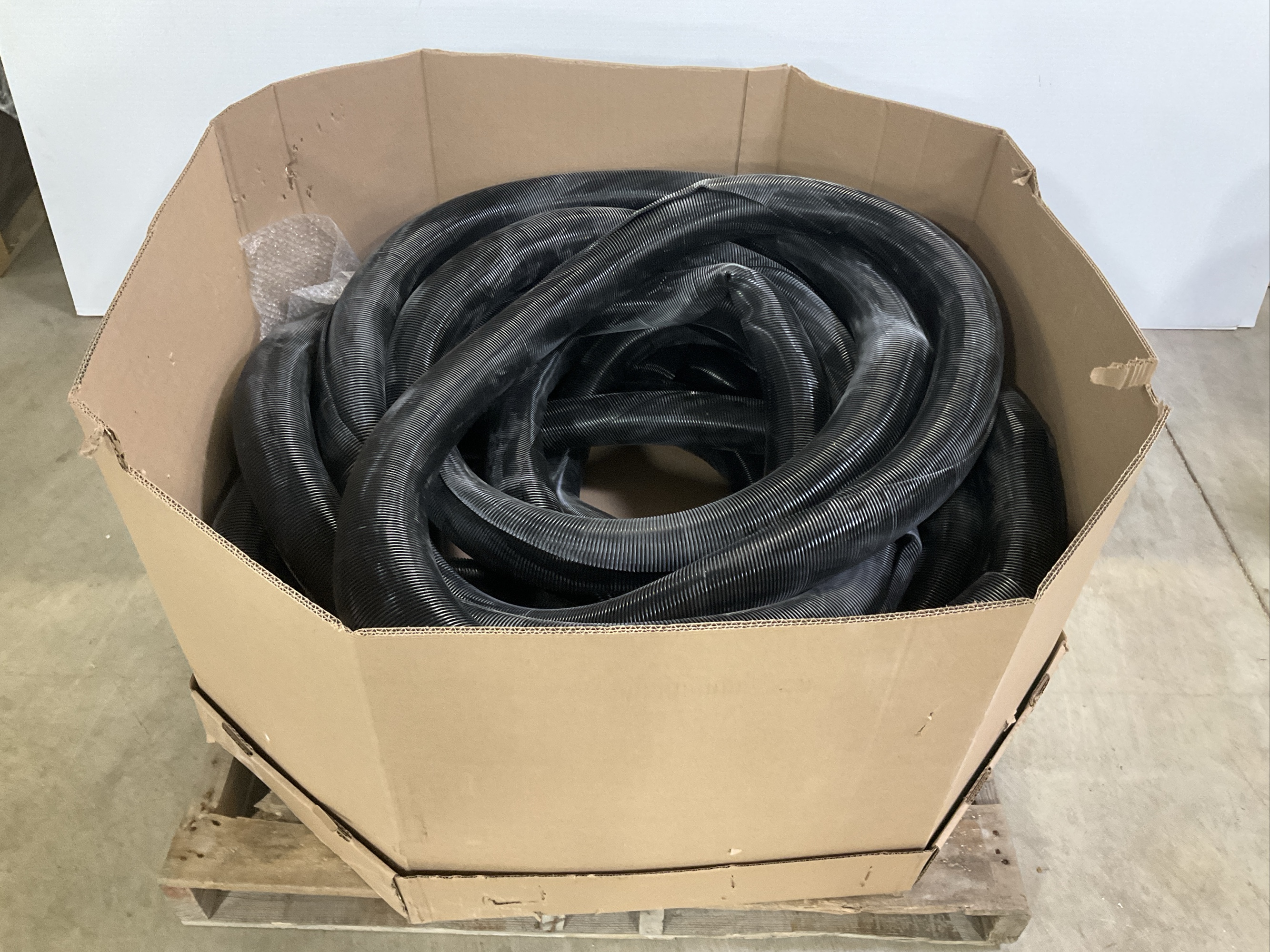 This lot includes a large quantity of flexible black tubing, perfect for various applications. The tubing is neatly packaged in a cardboard box, ready for use. It appears to be made of durable material and features a corrugated design for flexibility and strength.