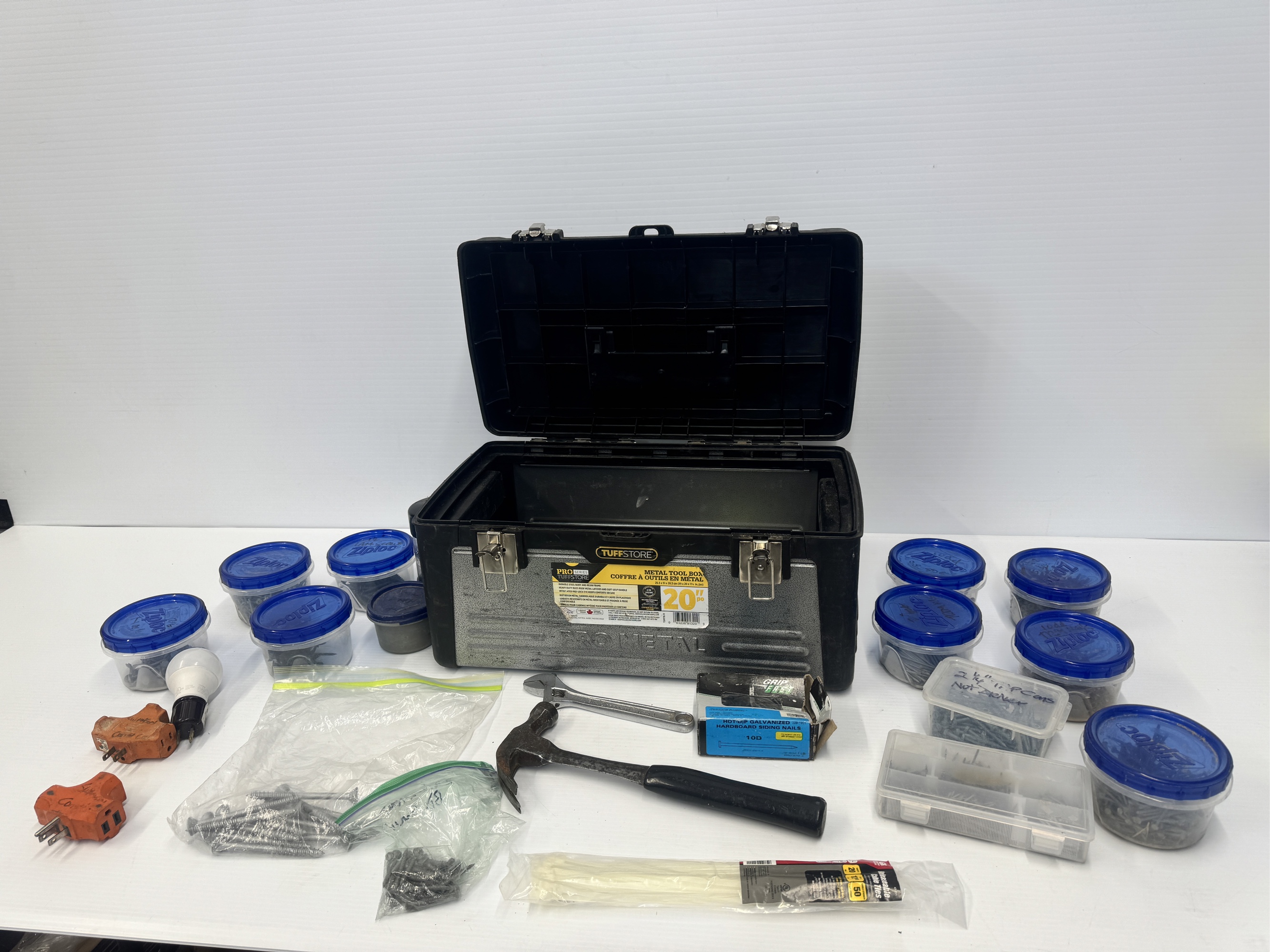 This lot contains a Tuffstore Pro Series metal tool box, along with a variety of hardware and tools. The hardware includes several containers of nails, screws, and other fasteners. The tools include a hammer, wrench, electrical connectors, and more.