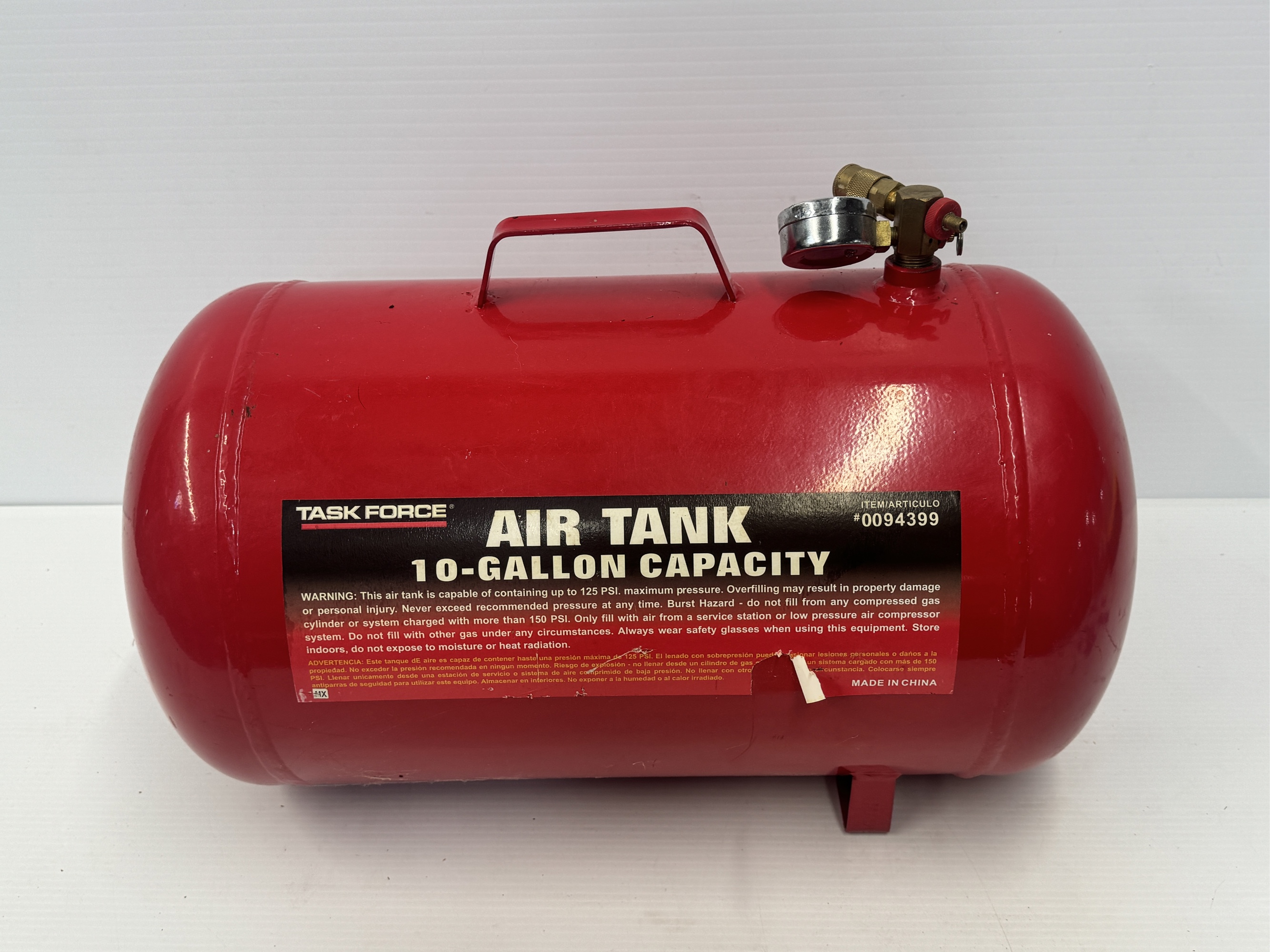 Red Task Force 10-gallon air tank. Includes pressure gauge and fittings.