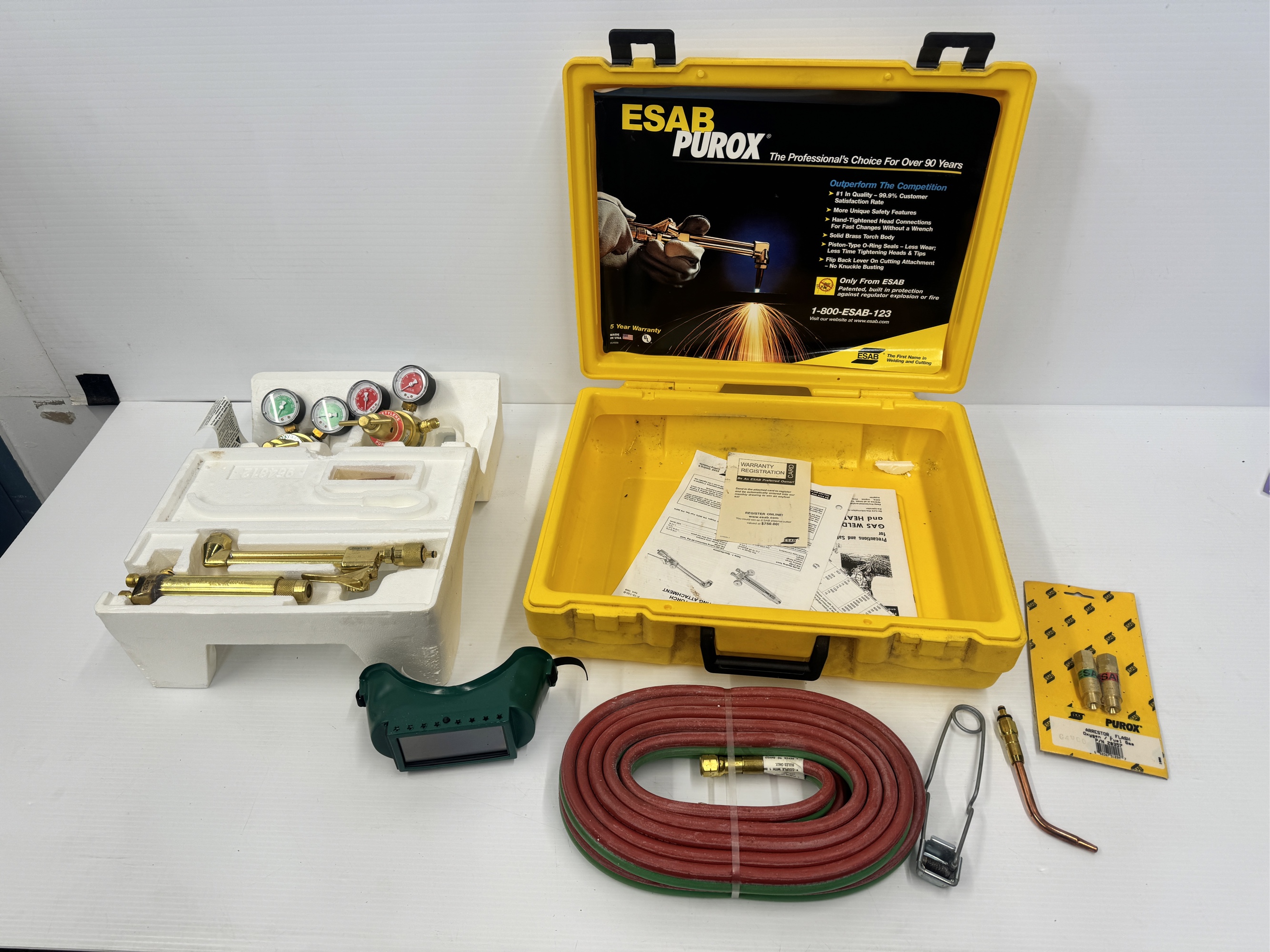 Complete ESAB Purox GT-250 Deluxe Welding and Cutting Outfit. This set includes a welding torch, cutting attachment, regulators, nozzles, welding heads, twin hose, friction lighter, and coverall goggles. Comes with a hard case and original paperwork.
