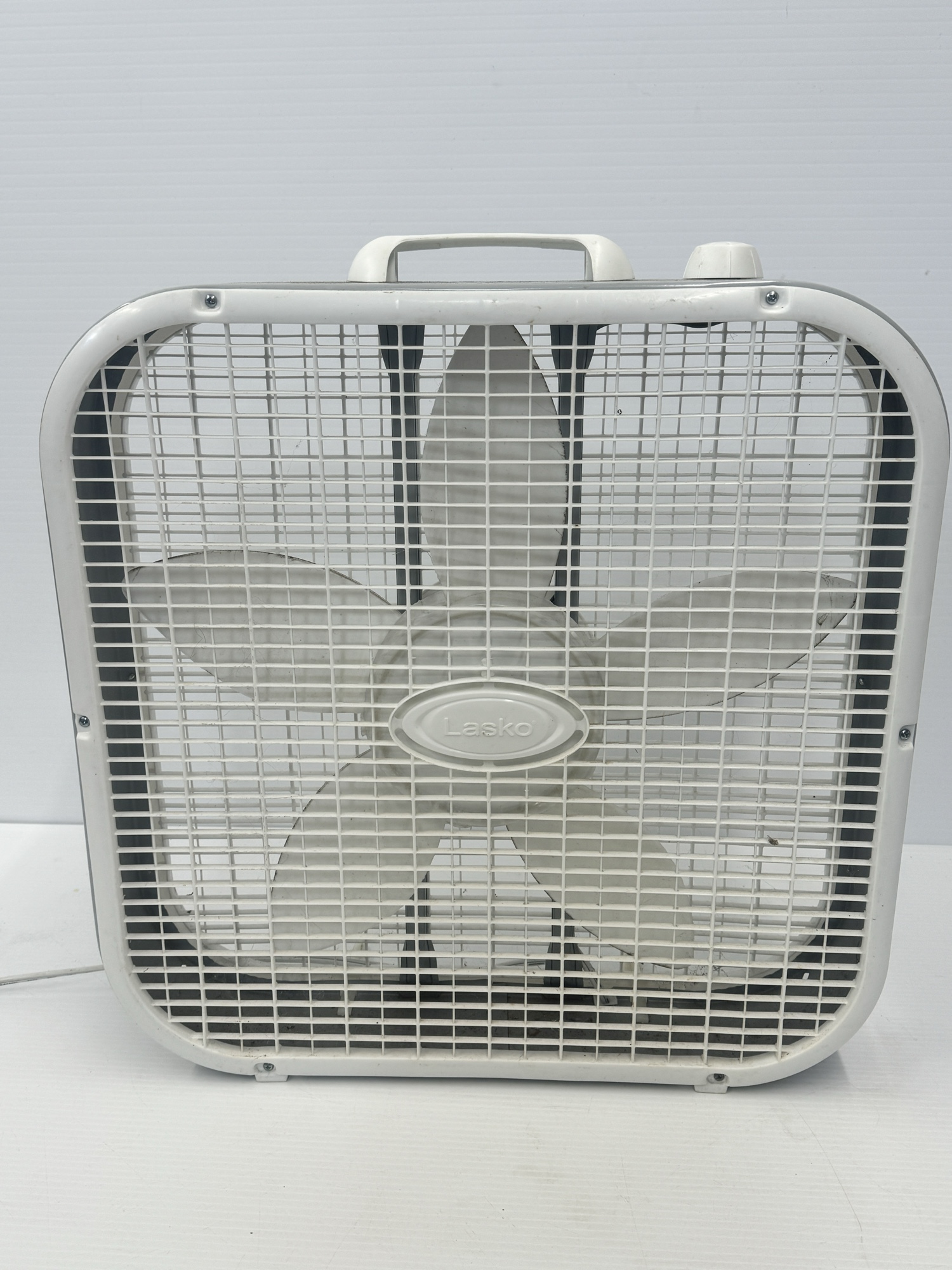 This is a Lasko white box fan with three speed settings and a carrying handle.