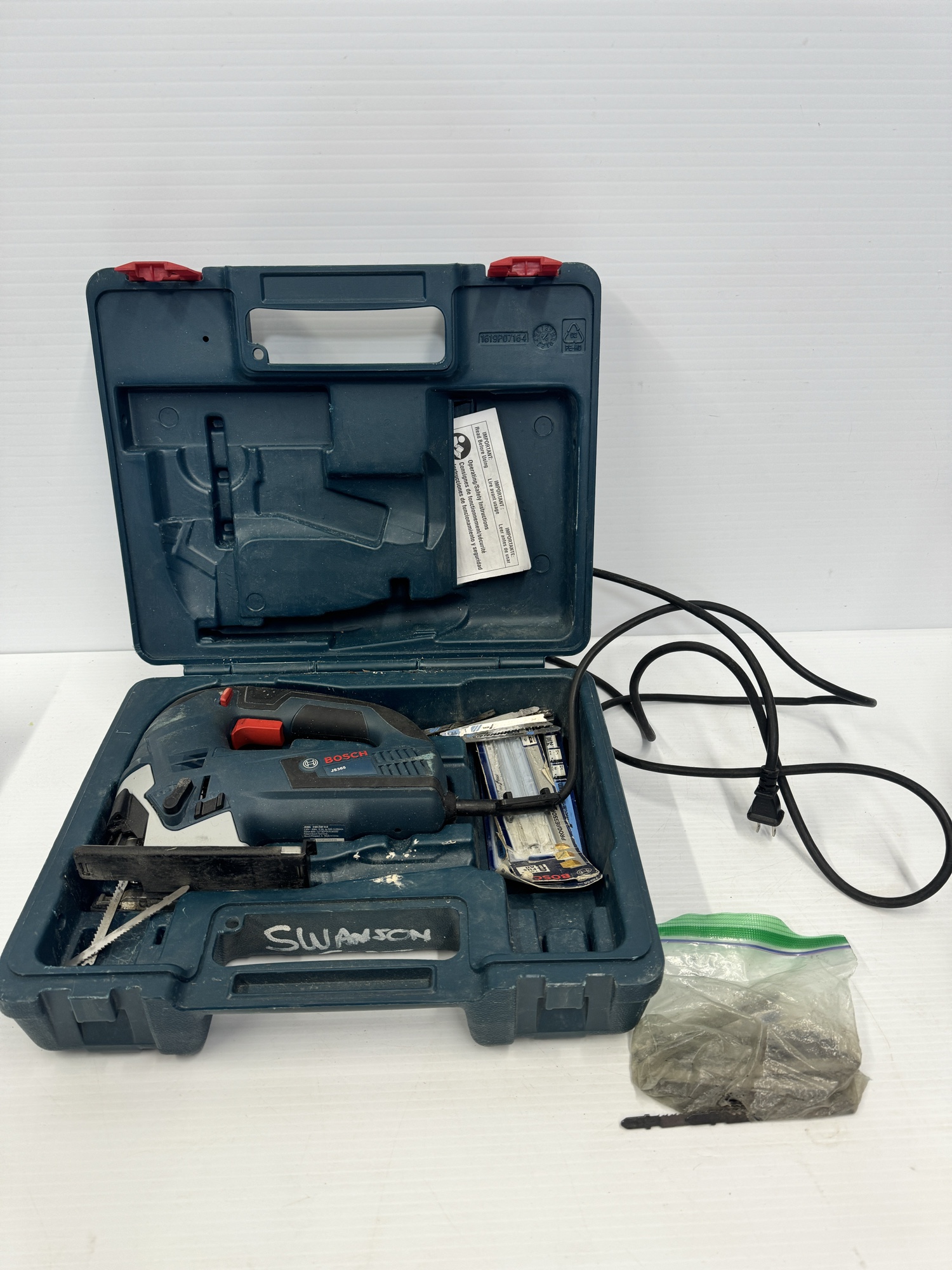This auction features a Bosch JS365 jigsaw, complete with a carrying case and additional jigsaw blades. The jigsaw is a JS365 model and is designed for 120V power. The set includes a sturdy carrying case marked with the Bosch logo and has a selection of jigsaw blades for various cutting tasks.