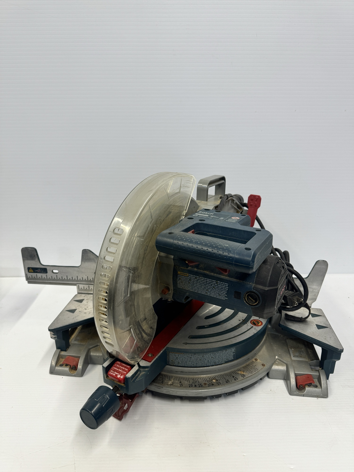 This is a Bosch CM12 12-inch miter saw. It features a 12" general purpose blade with an extra fine cut.