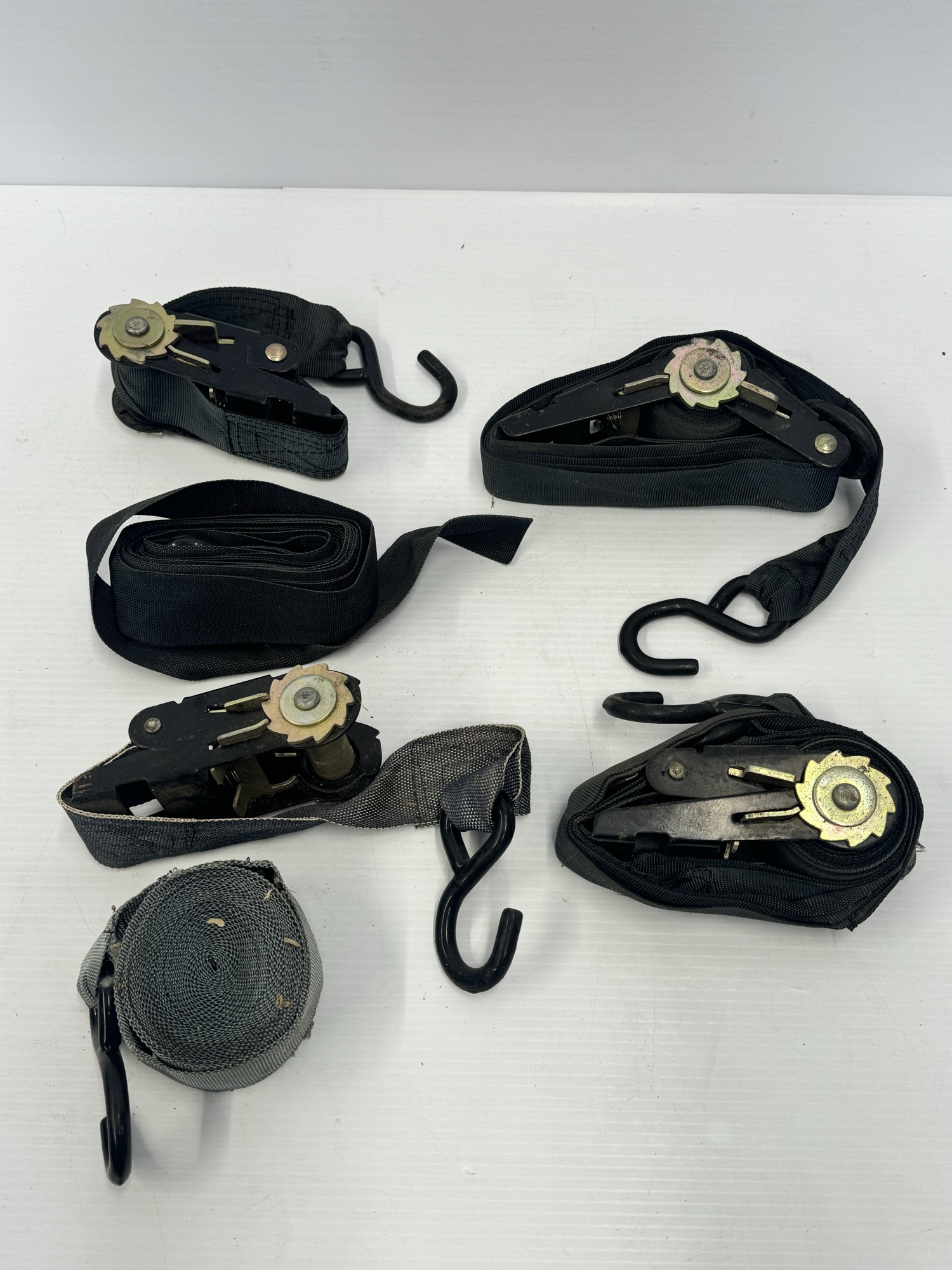 Set of ratchet straps for securing cargo. Includes straps and ratchet mechanisms with hooks. Straps are approximately 2 inches wide.