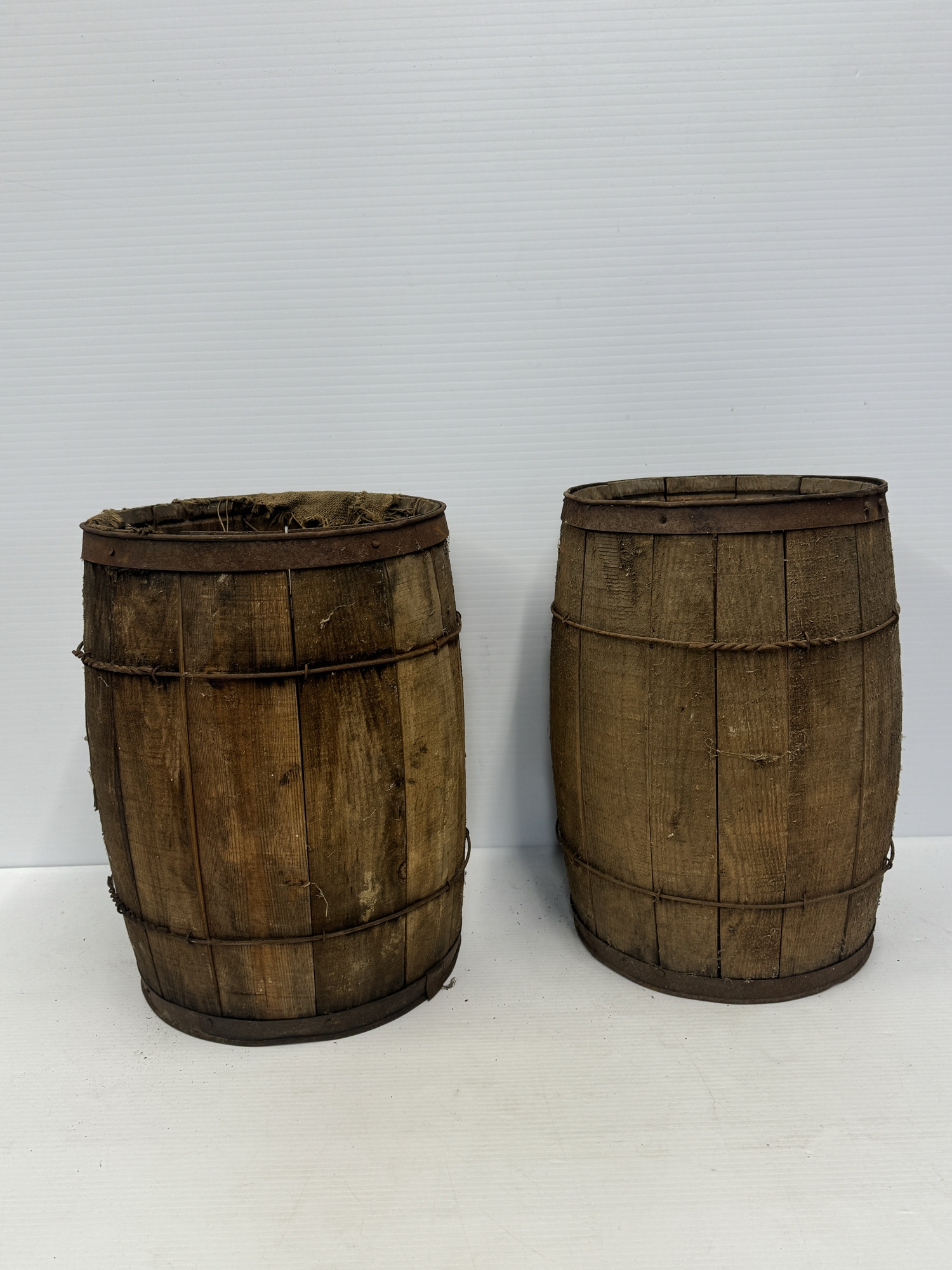 This listing includes a set of two rustic wood barrels. Each barrel features wooden staves held together with metal bands, creating a traditional barrel shape. They have an open top. 18 x 12 in.
