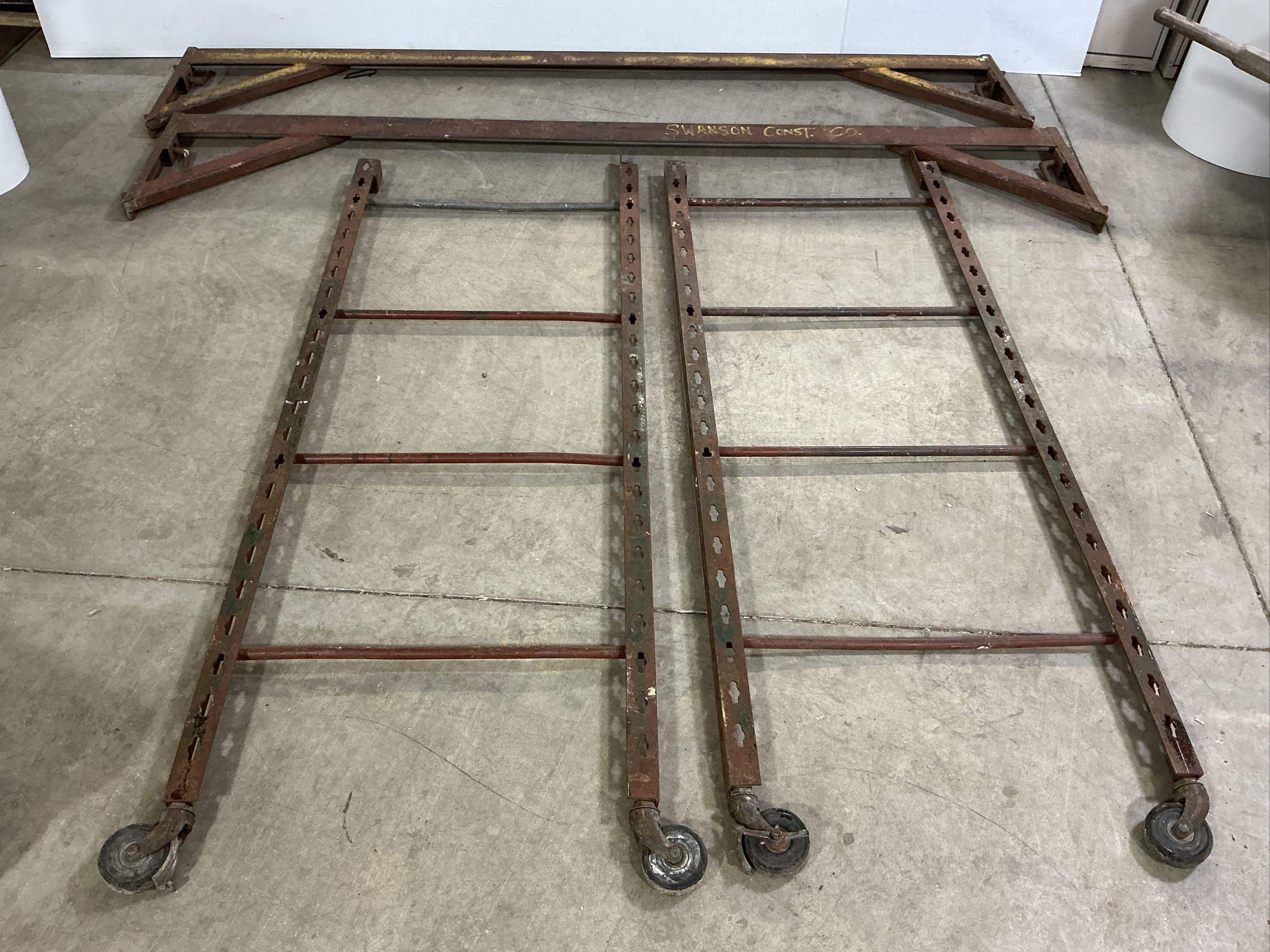 Scaffolding. Includes two vertical ladders with wheels, and supporting horizontal beams. 76 x 97 x 29 in.