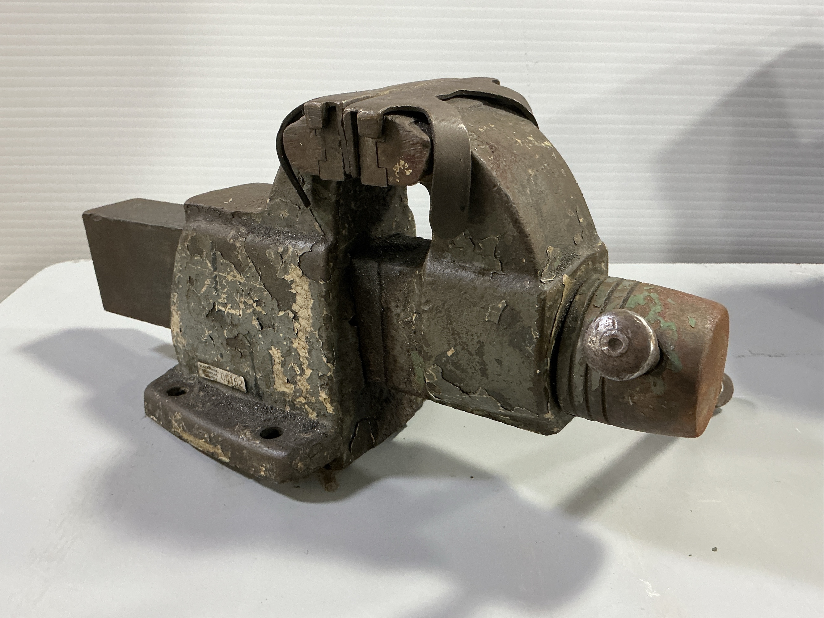 This listing is for a bench vise. It measures approximately 4 inches between the jaws when closed. The vise has visible wear and chipping of paint.