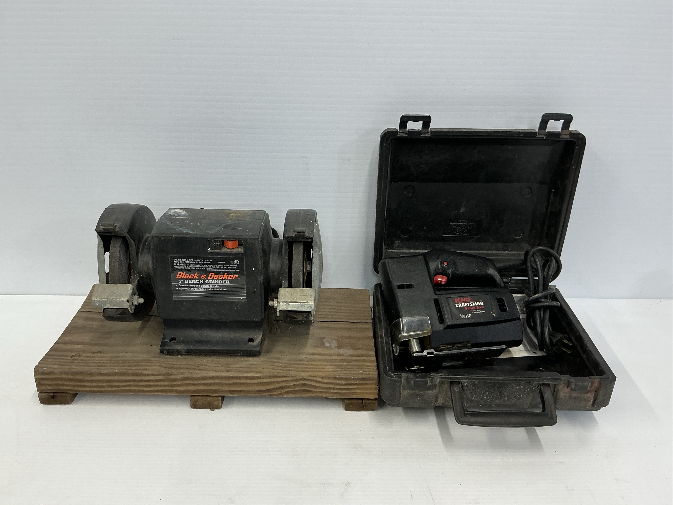 Includes a Black & Decker 5 in. bench grinder and a Craftsman Sabre Saw with case and manual.