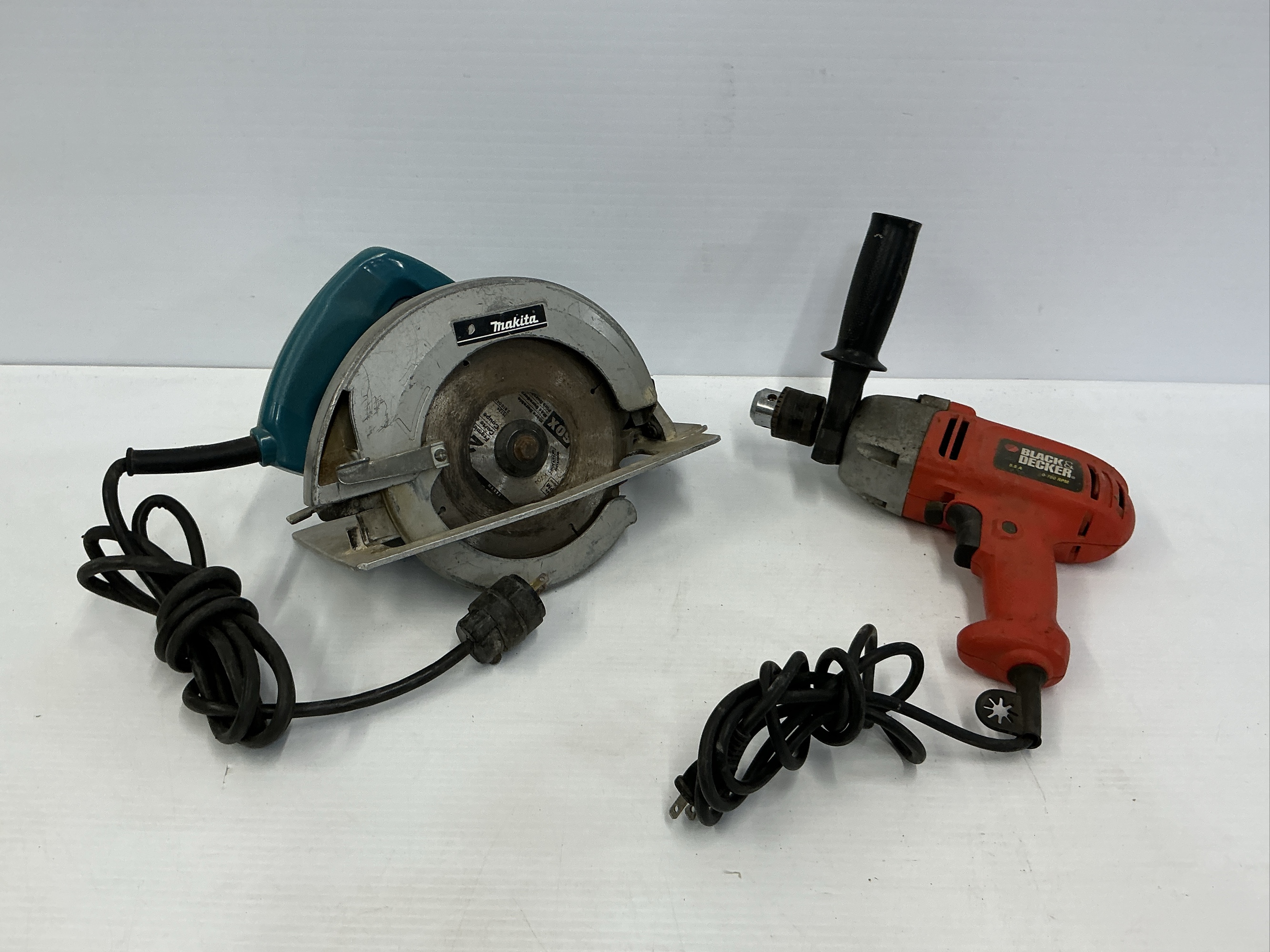 Includes a Makita model 5007NB circular saw (7-1/4 in. blade size) and a Black & Decker drill. Both items appear to be corded power tools.