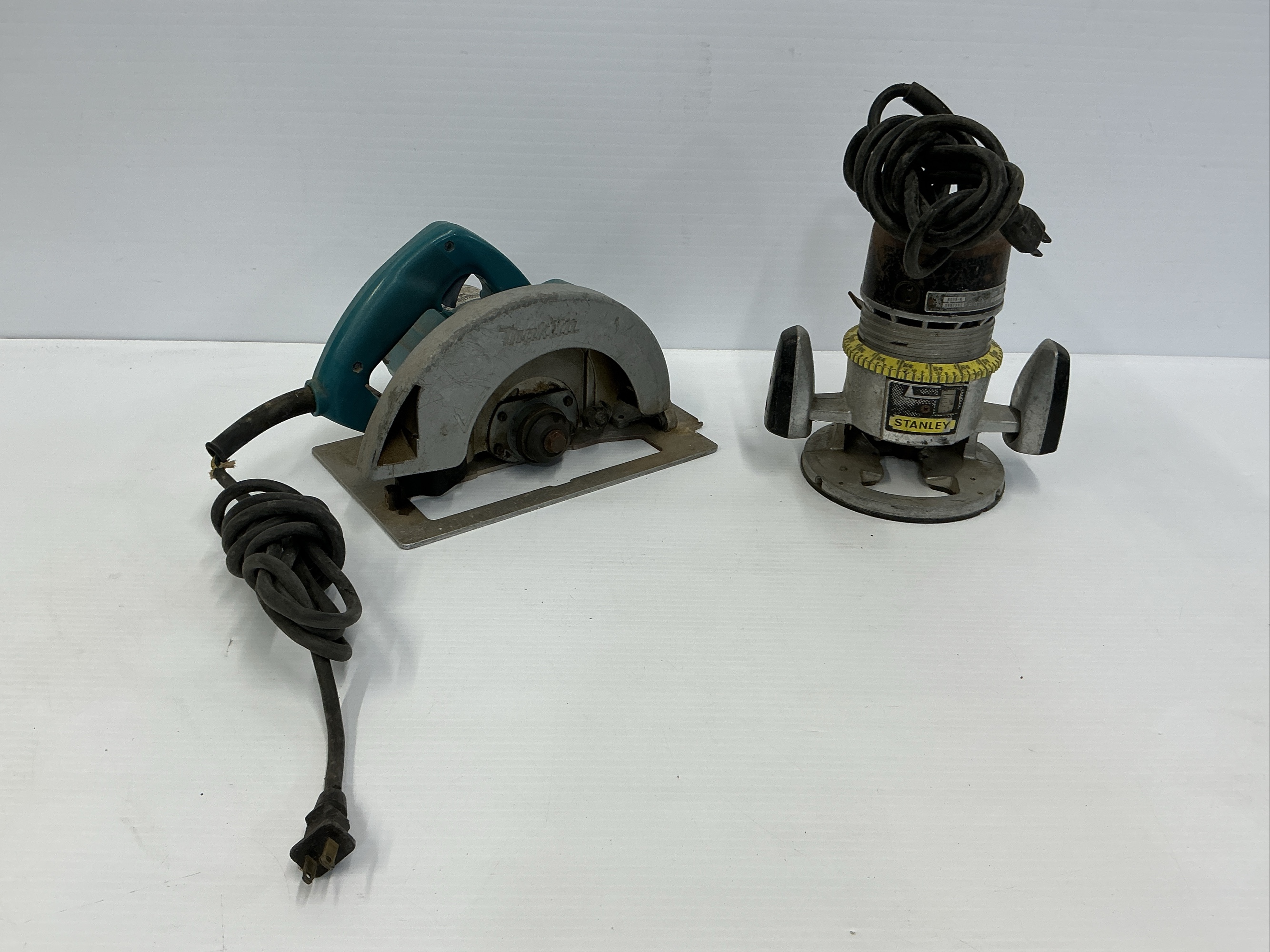 Includes one Stanley Router and one Makita 5007NB 7-1/4" Circular Saw. The cord of the circular saw shows some damage, please review the photos.