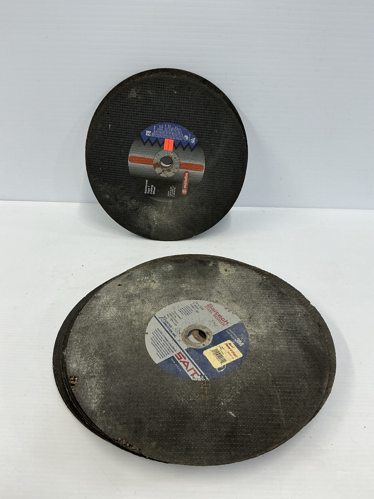 This lot features a collection of metal cutting wheels from well-known brands. You'll find Magna-Cut, Sait, Metabo, and Nicholson wheels in various sizes, including 12 inch and 14 inch diameters. These wheels are designed for metal cutting and are suitable for chop saws and grinders. See photos for details.