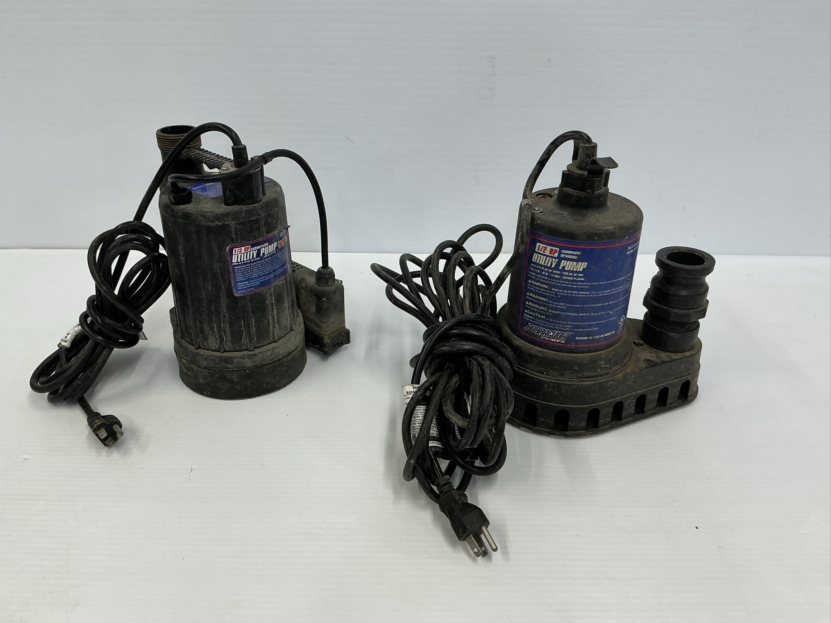 Lot of 2 Sump Pumps, includes one Barracuda 1/2 HP Submersible Utility Pump, Model #91596, and one Fully 1/3 HP Submersible Utility Pump, Model #84033