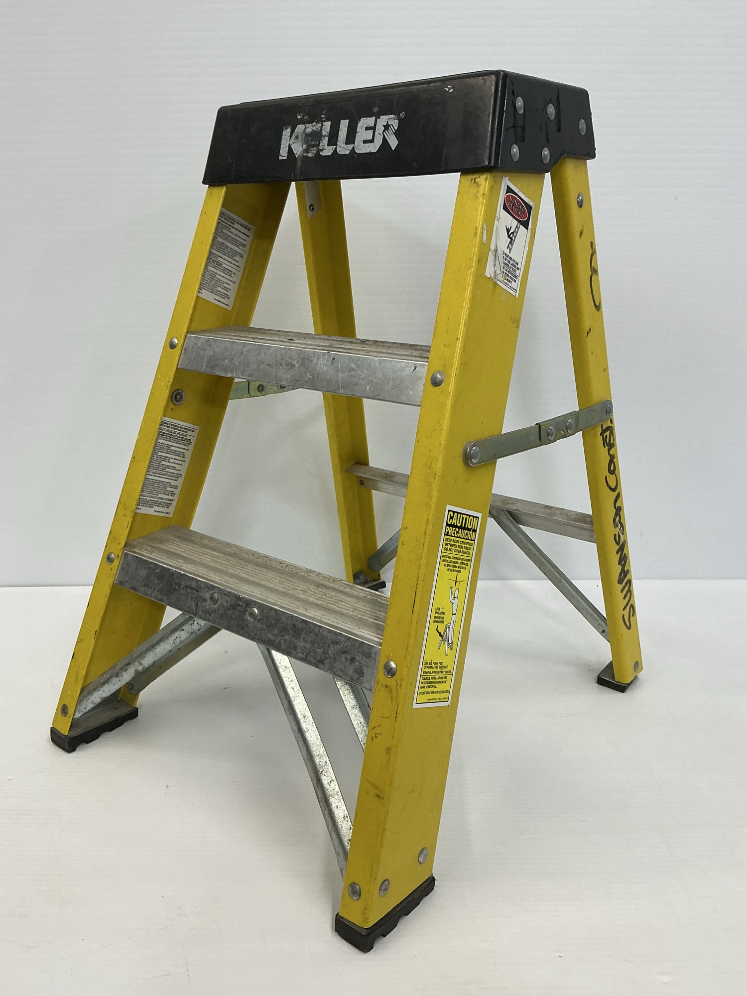 This listing is for a used Keller 26" fiberglass step stool. It features a heavy-duty design suitable for industrial use, with a 250 lbs load capacity.