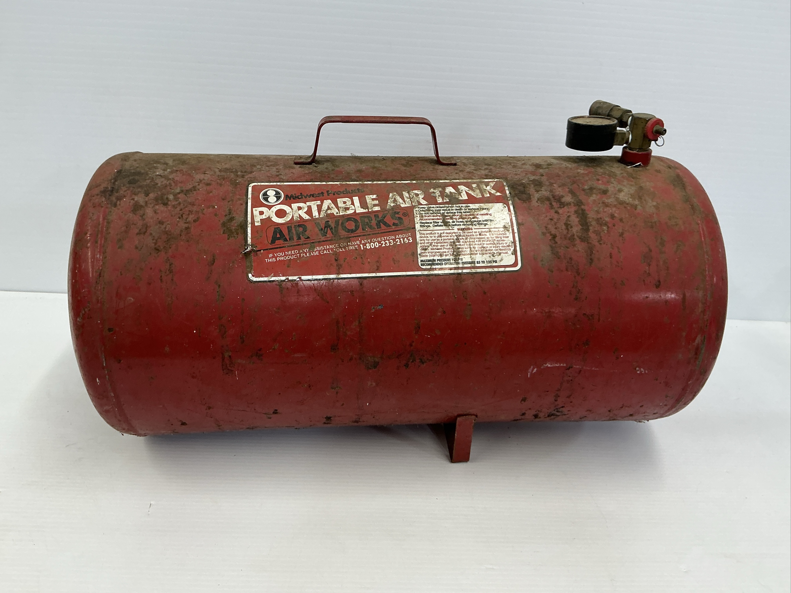 Midwest Products Air Works portable air tank. Item shows wear from use. Maximum pressure 125 PSI. Recommended operating pressure 85 to 125 PSI.