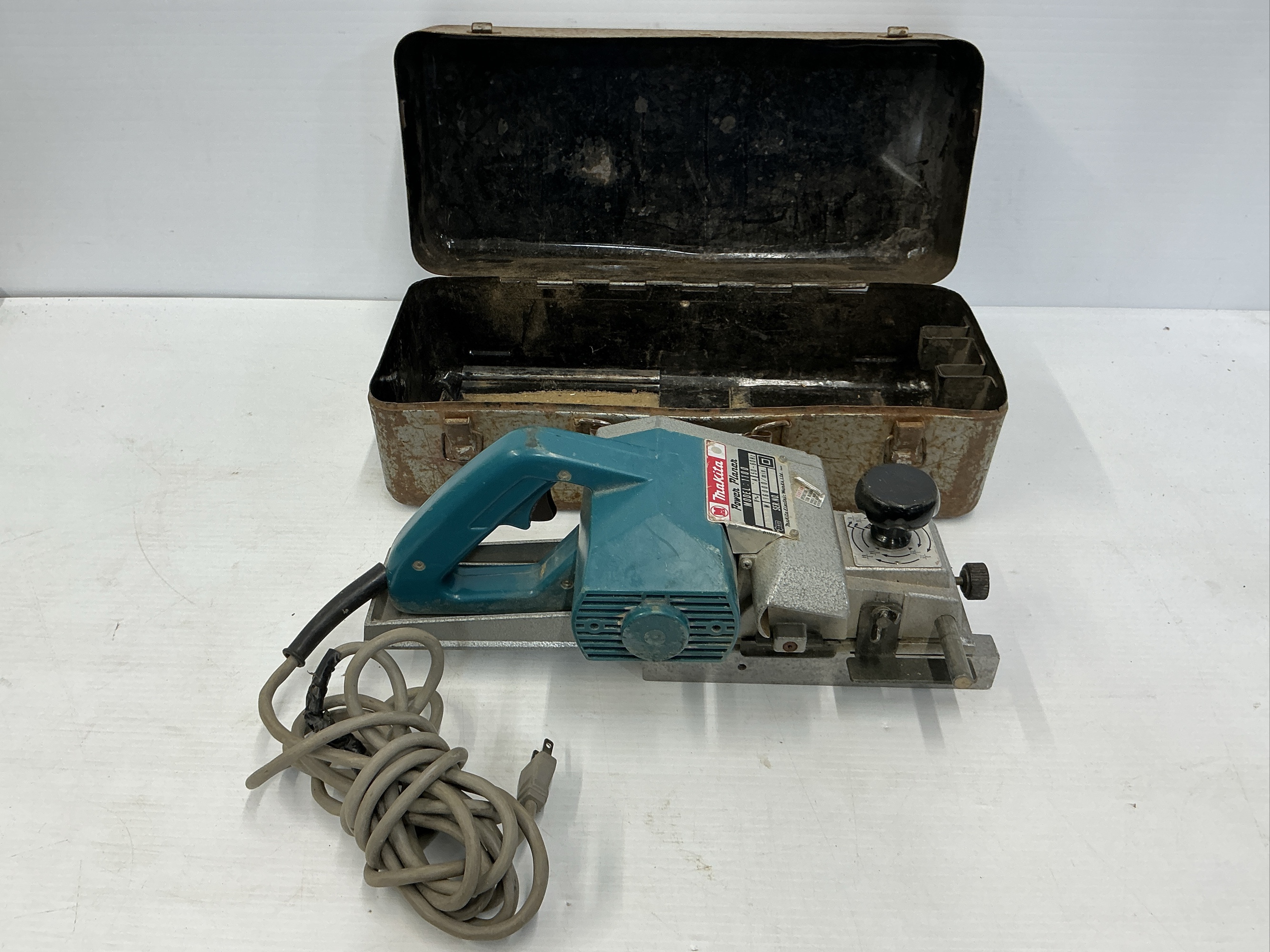 Makita power planer model 1100 with its original case. The planer is turquoise and silver colored and has a gray cord. The case is metal. Includes accessories that were found inside the case.