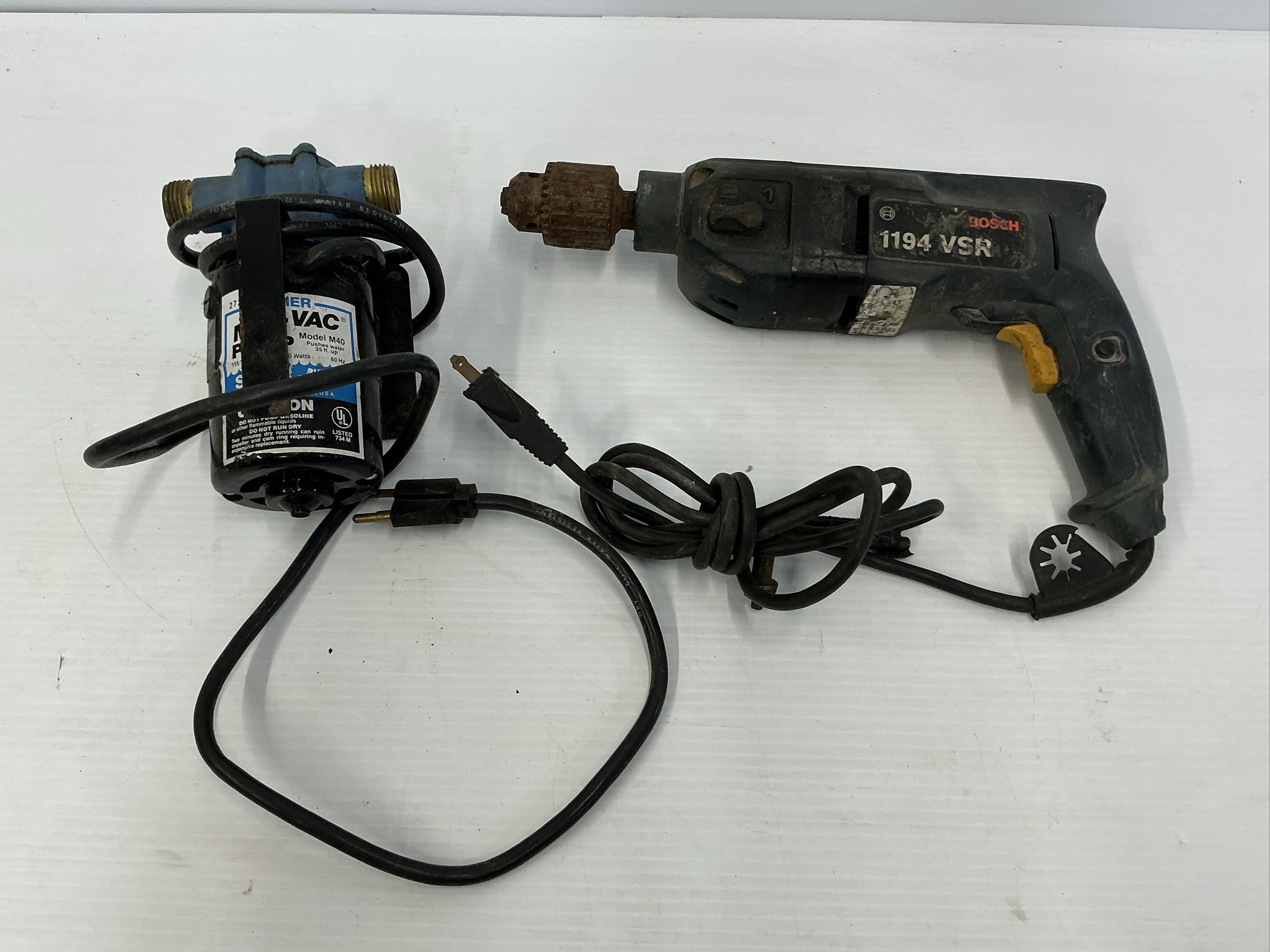 Included in this lot are a Simer Hi-Vac Model M40 water pump and a Bosch 1194 VSR drill. Both items appear to be in used condition, with signs of wear and use.