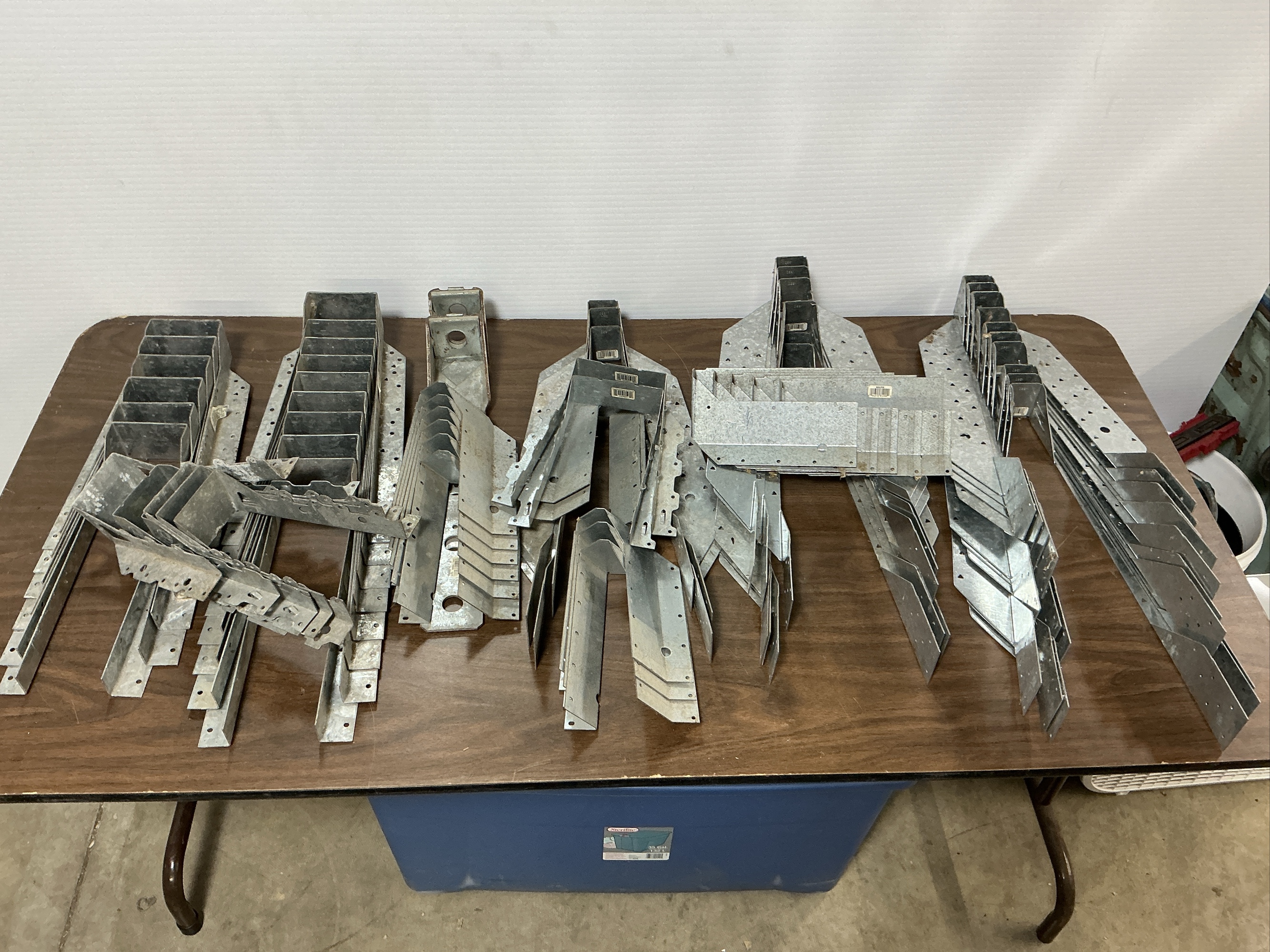 A large selection of various sizes and styles of metal framing hardware, primarily joist hangers.