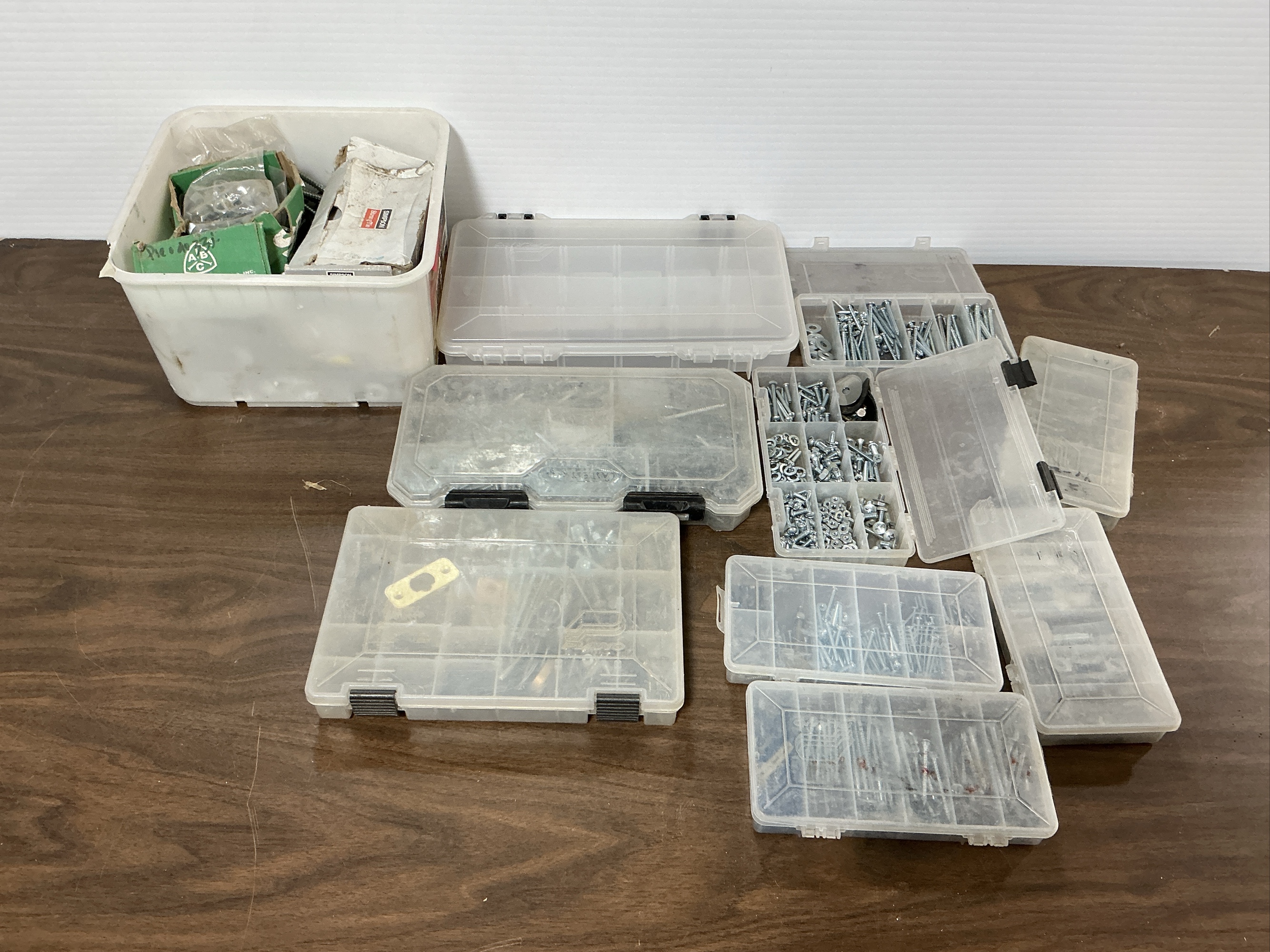 A selection of fasteners including nails, bolts, screws, and other hardware. Includes multiple storage cases and boxes.