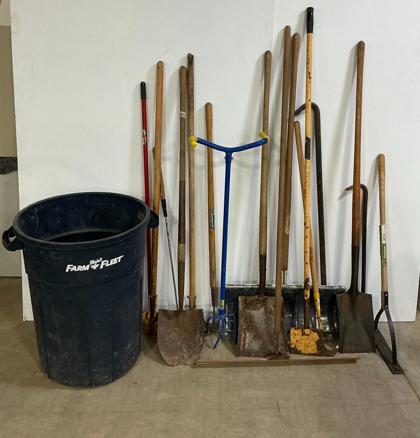 Includes various shovels, rakes, and a farm fleet trash bin. These tools could be used for yard work, gardening, and more.