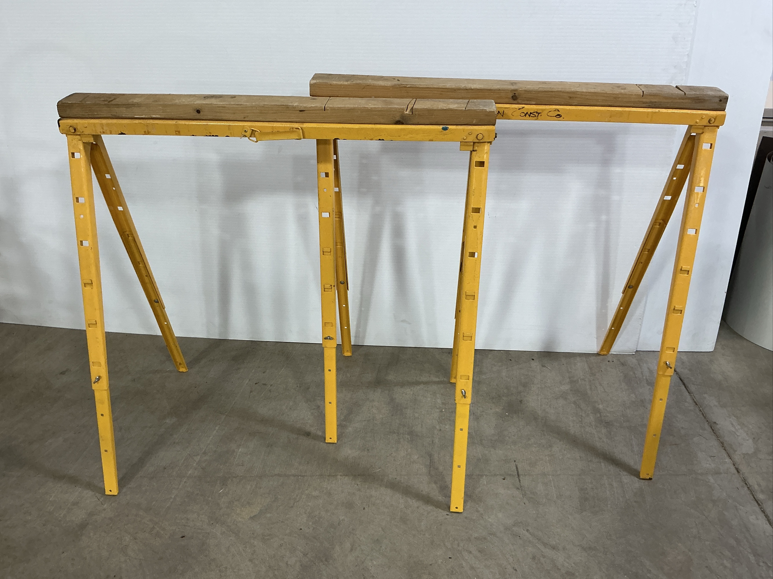 Two yellow adjustable height saw horses. Each has a wooden top. 39 x 38 in.