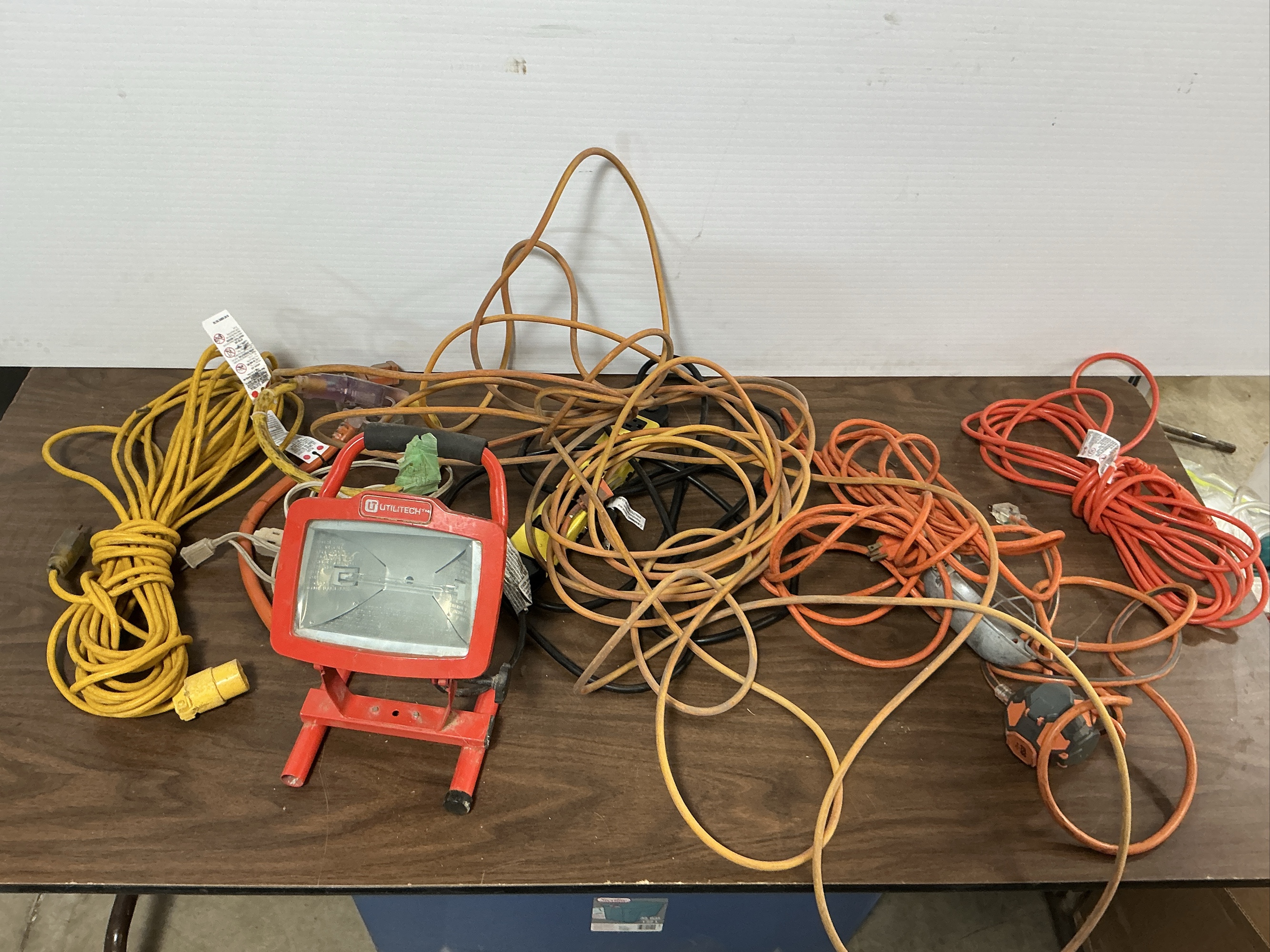 This lot features a Utilitech work light with a red metal frame, along with a variety of extension cords in different lengths and colors, perfect for a range of electrical needs.