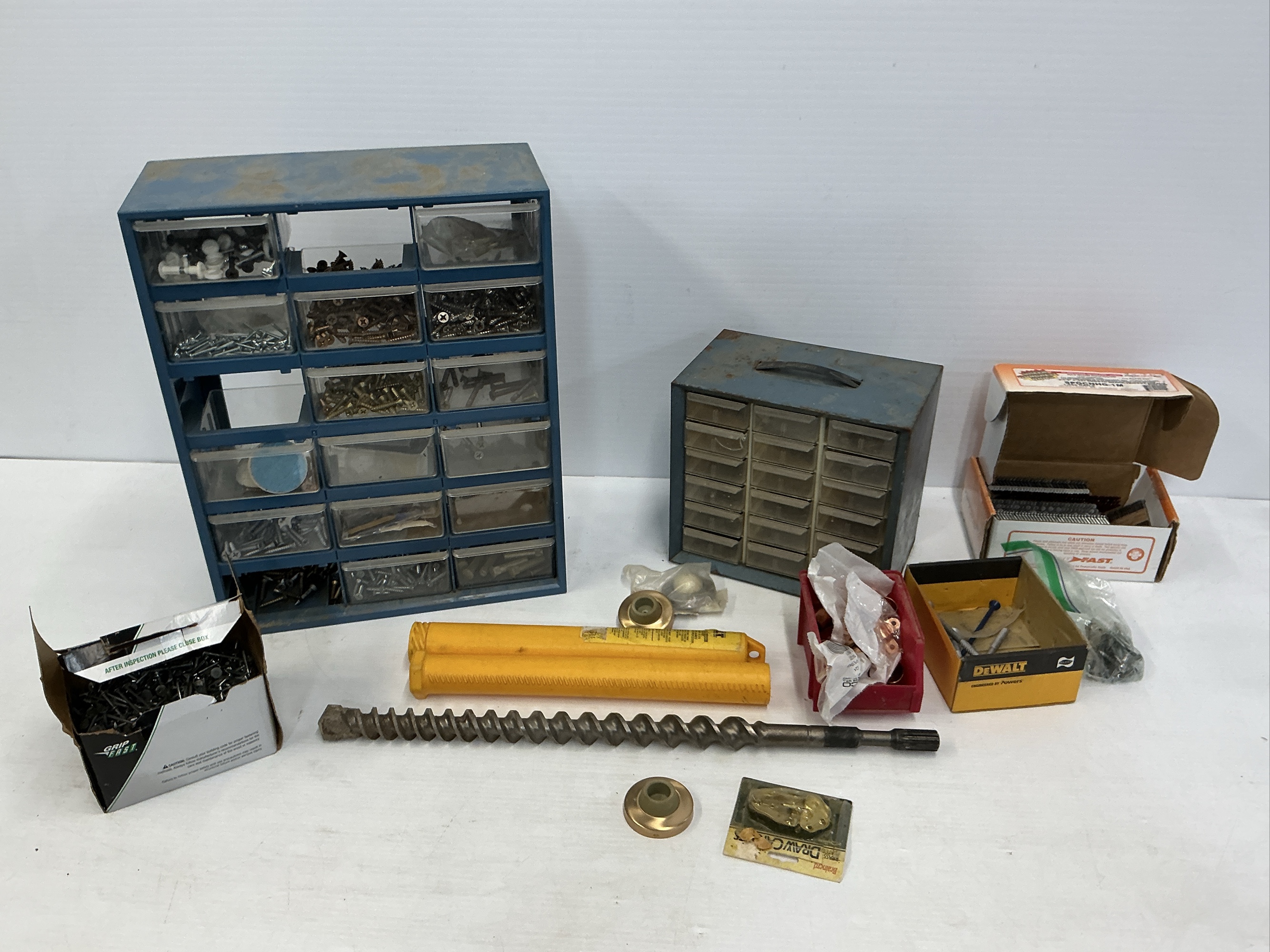 Includes two multi-drawer cabinets, one filled with various screws, nails, and fasteners. Also includes a large drill bit, loose fasteners and hardware.
