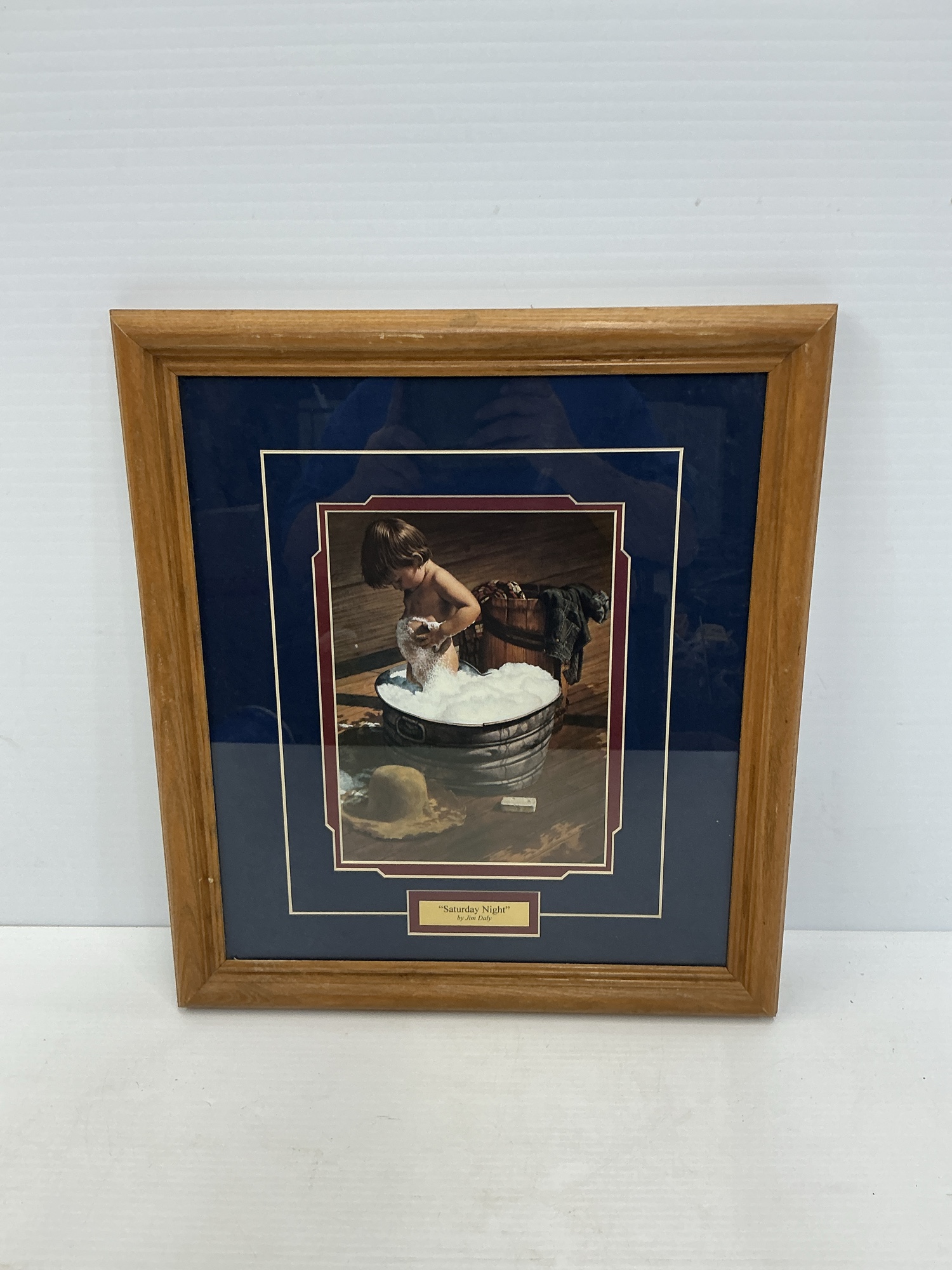 This framed art print is titled "Saturday Night" and is by the artist Jim Daly. The print depicts a young child bathing in a metal tub. It features a wooden frame with blue and burgundy accents. 19 x 17 in.
