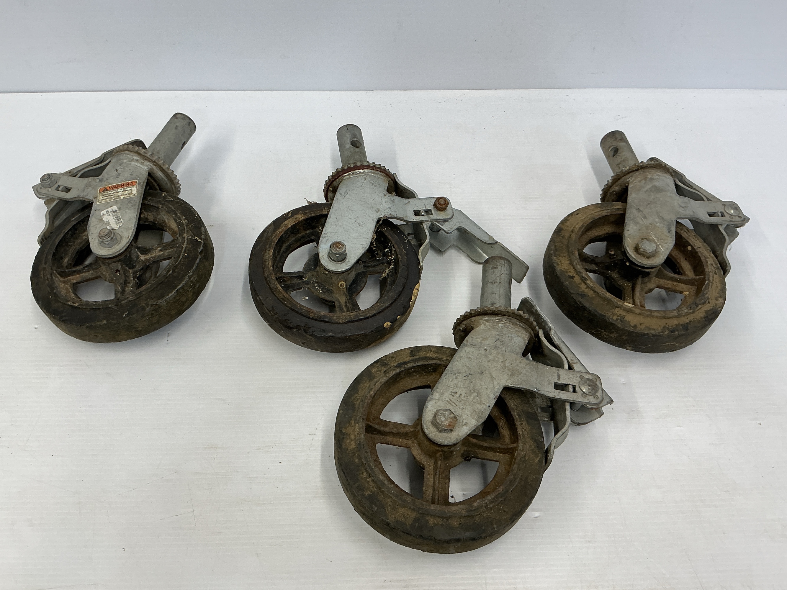 This lot includes a set of four industrial caster wheels. These wheels appear to be heavy-duty with a metal frame and possibly rubber or composite wheel material. Each caster has a stem for mounting to equipment or scaffolding.
