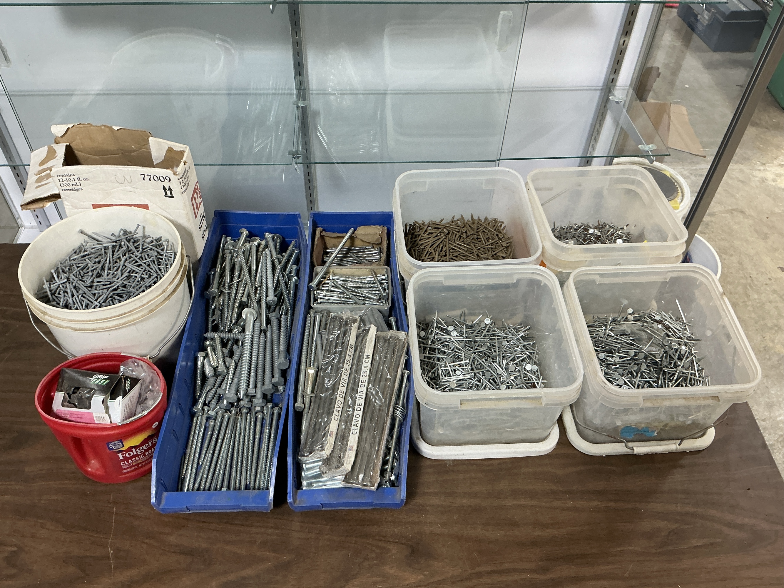A large assortment of various types of nails, screws, and fasteners. Sold as a bulk lot.