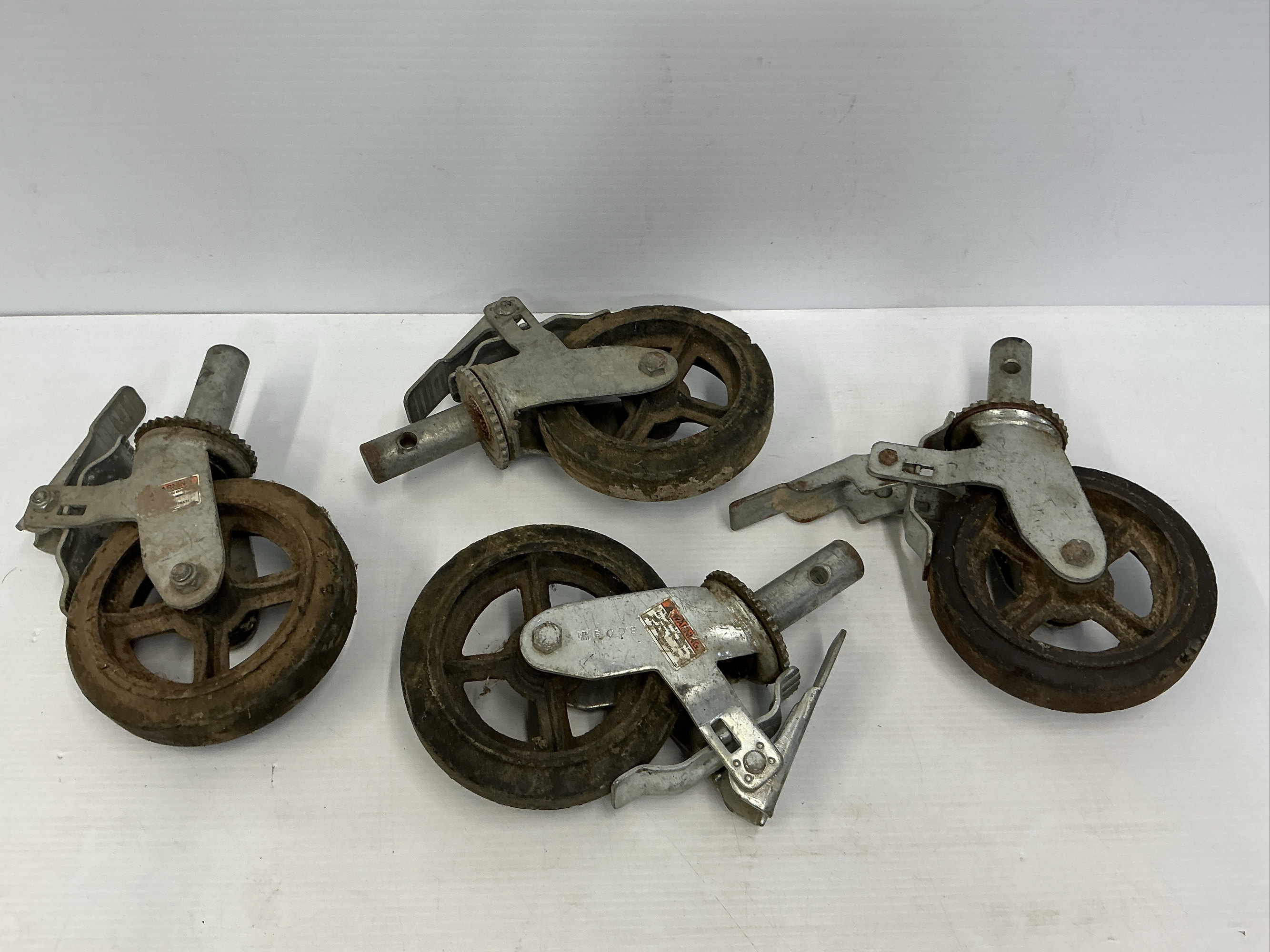 This auction features a set of four scaffolding casters. Each caster includes a locking mechanism and is designed for use on scaffolding equipment.