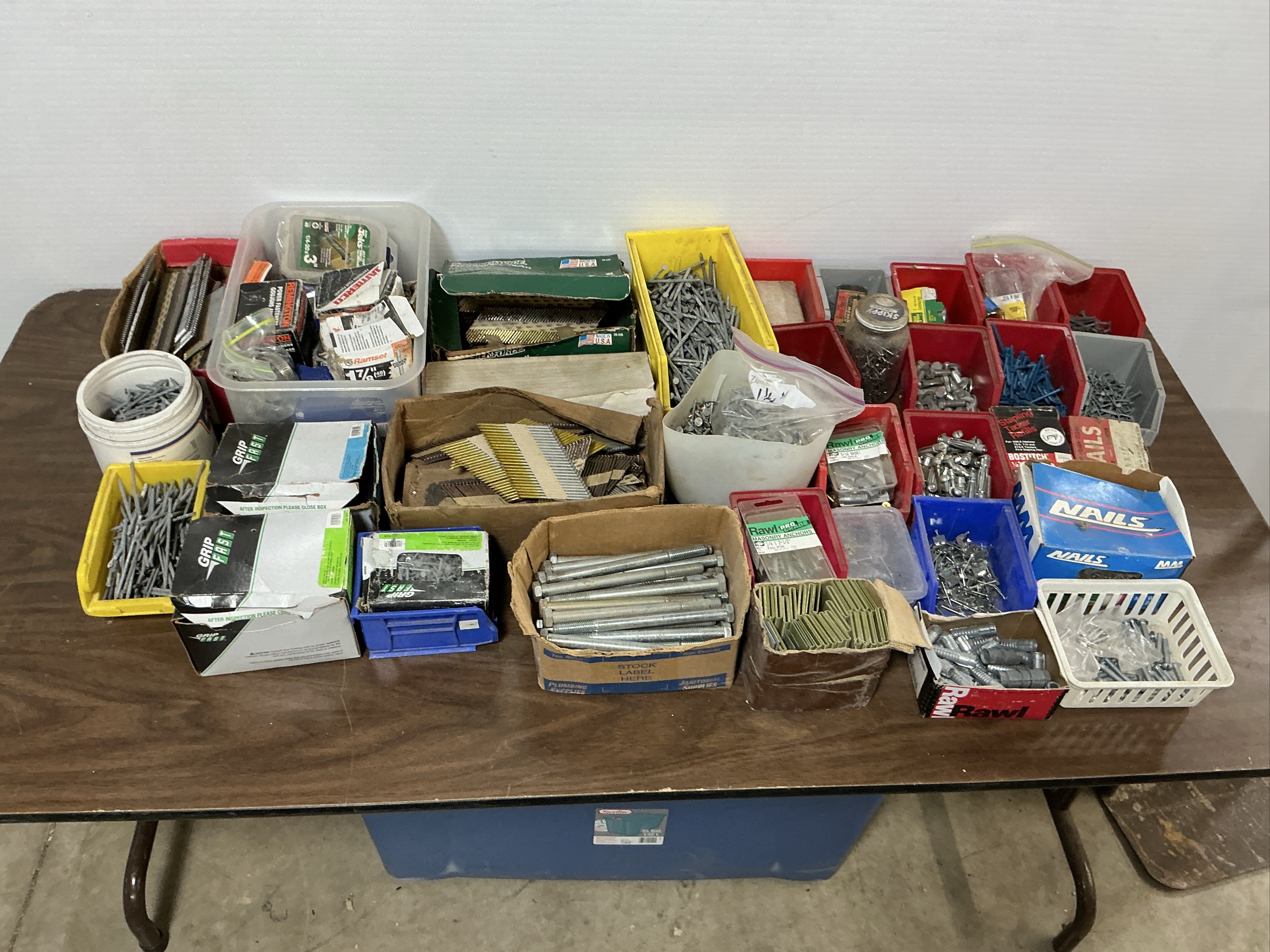 This lot includes a wide variety of nails, screws, anchors, and fasteners in various sizes. There are nails, screws, and other fasteners in bins, boxes, and jars.