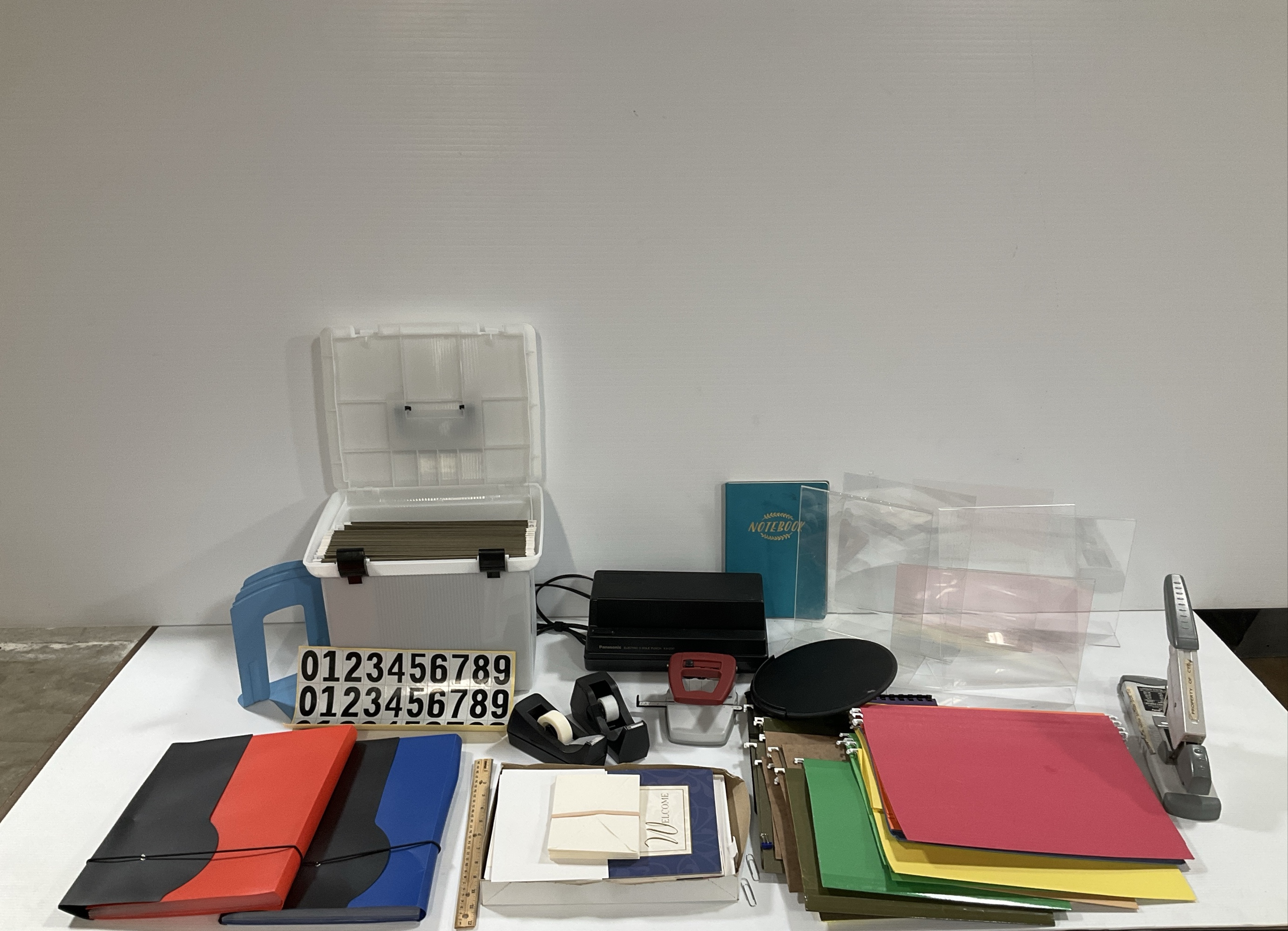 This lot includes a variety of office supplies such as file folders, notebooks, a Panasonic electric 3-hole punch KX-20P, a heavy-duty Swingline stapler, tape dispensers, display stands, and a file box with hanging file folders. Also included are greeting cards.