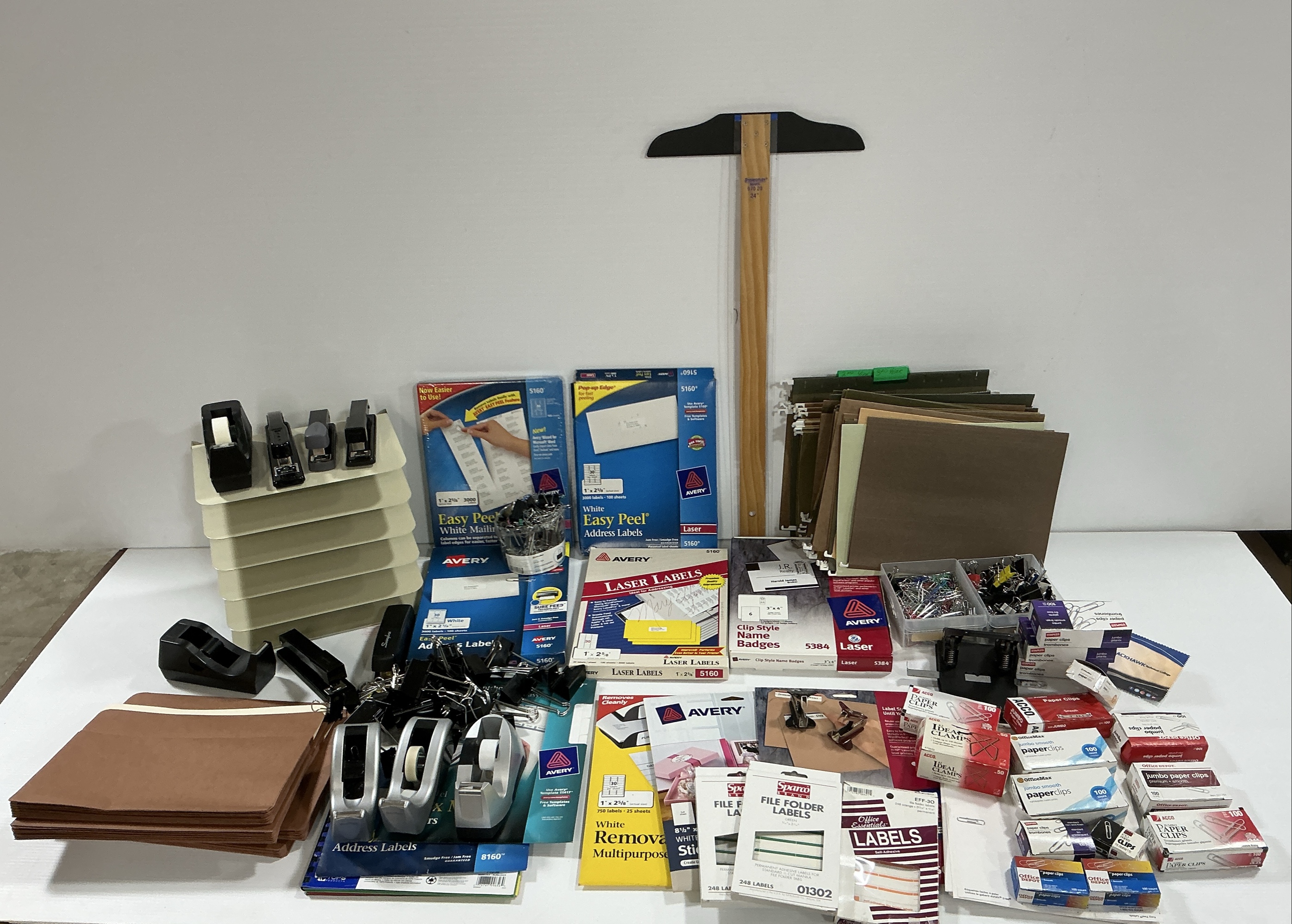 This lot includes a variety of office supplies, such as Avery labels (various sizes and types), staplers, tape dispensers, paperclips, binder clips, file folders, label removers, and a T-square.