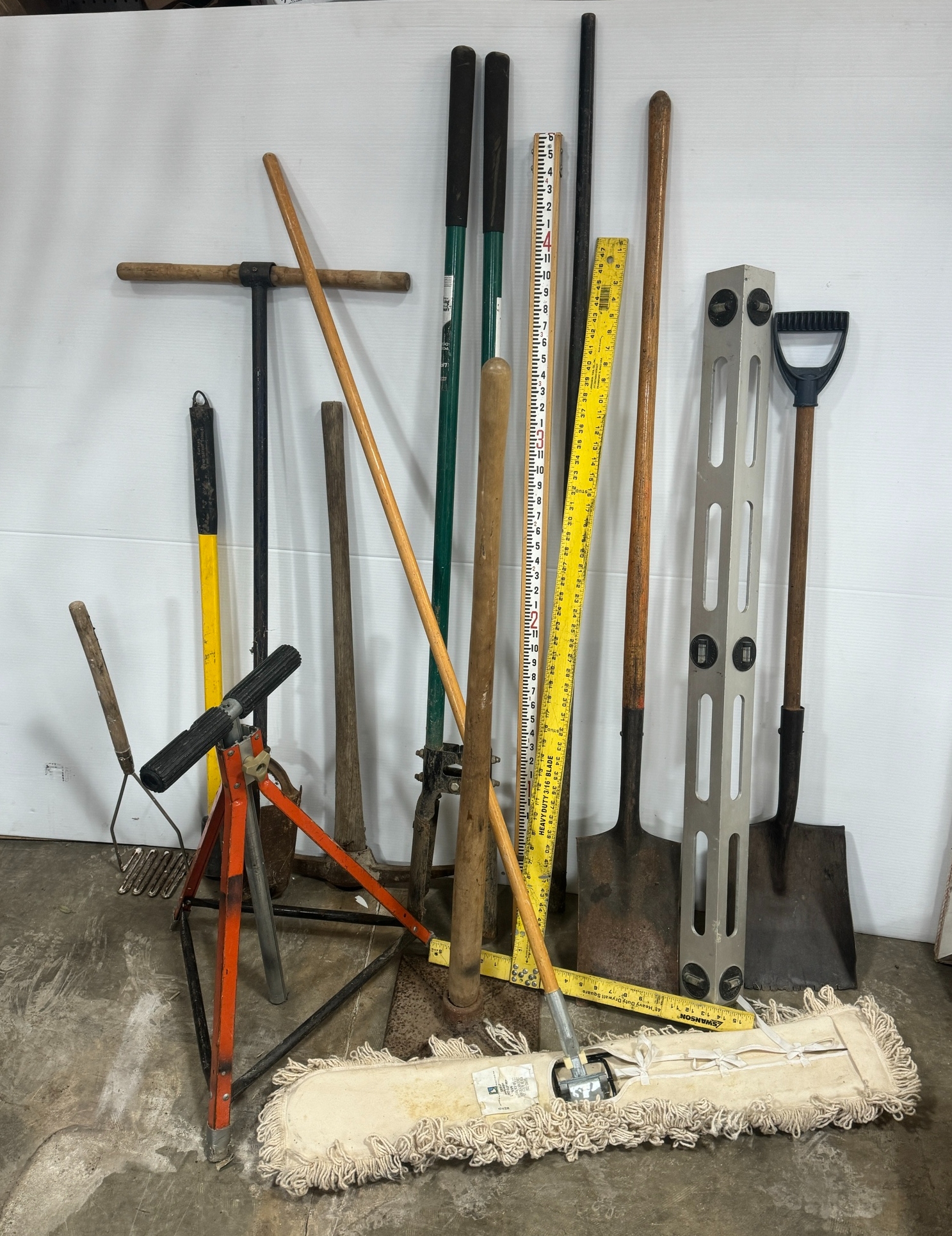 This lot features a variety of tools including several shovels, a post hole digger, a level, a dust mop, drywall square and more.