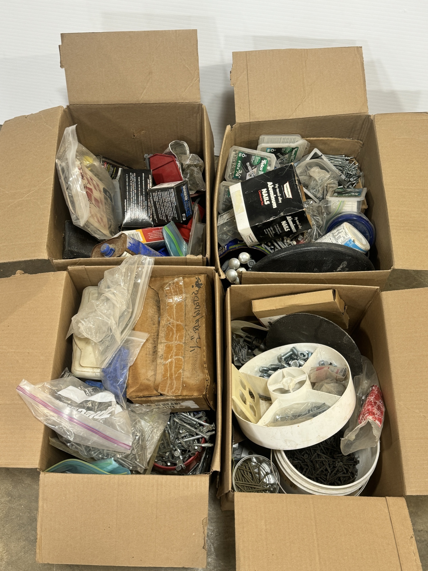 This listing is for four boxes filled with a variety of hardware items. Includes boxes and containers of nails, screws, fasteners, sandpaper, and other hardware pieces.