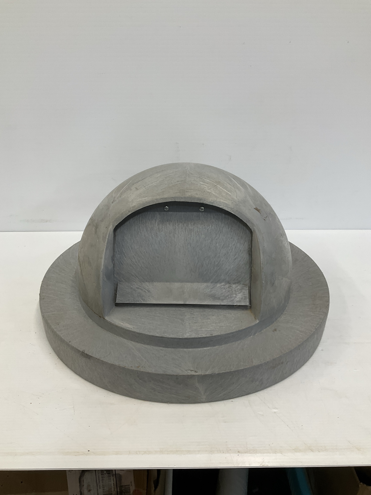 Gray dome-shaped trash can lid. It features an opening for trash disposal. 16 x 22 in.
