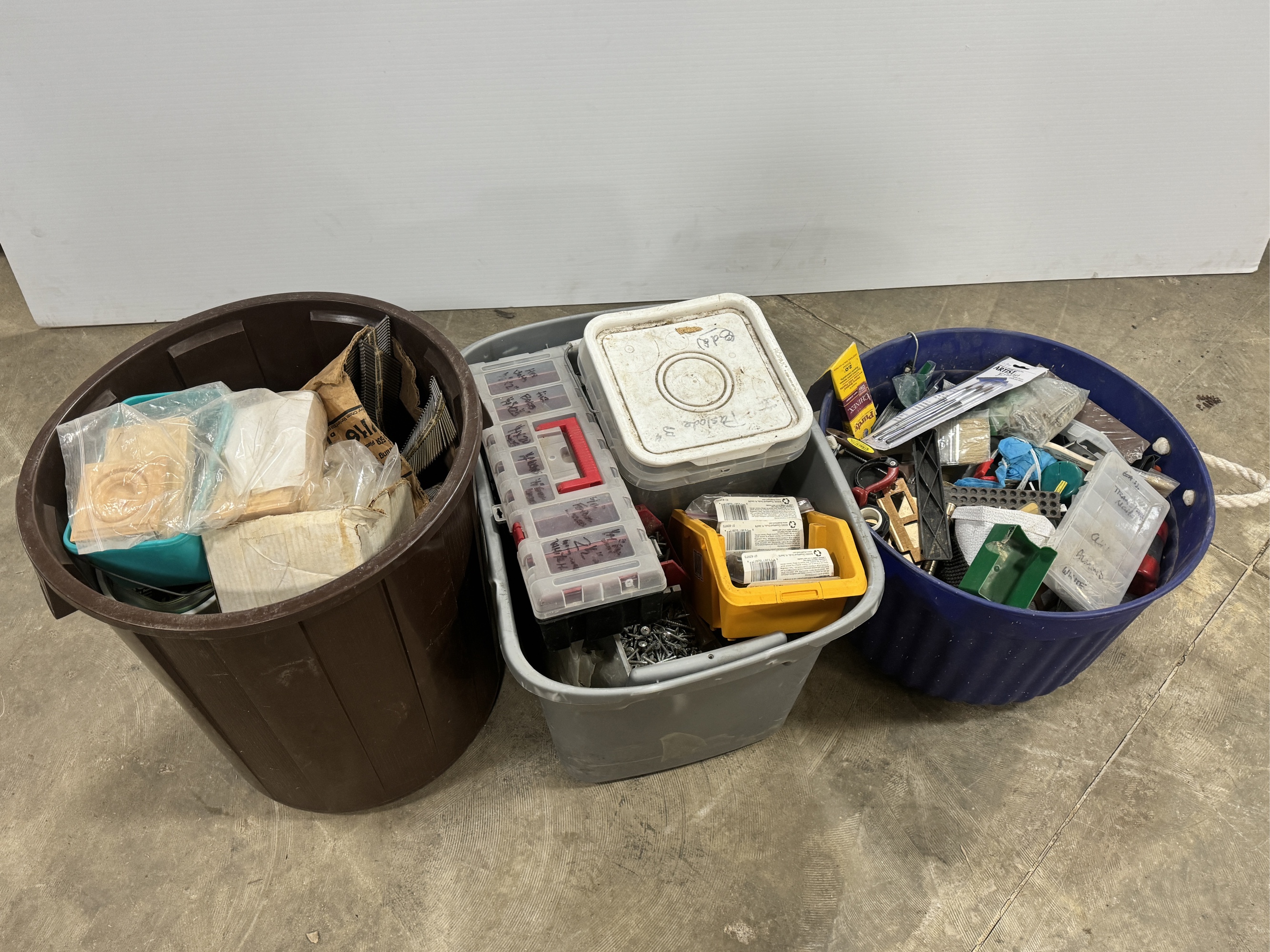 This lot includes three buckets filled with a variety of items. There are various hardware pieces, including screws, nails, bolts, and fasteners. Also included are painting supplies such as brushes and shims.