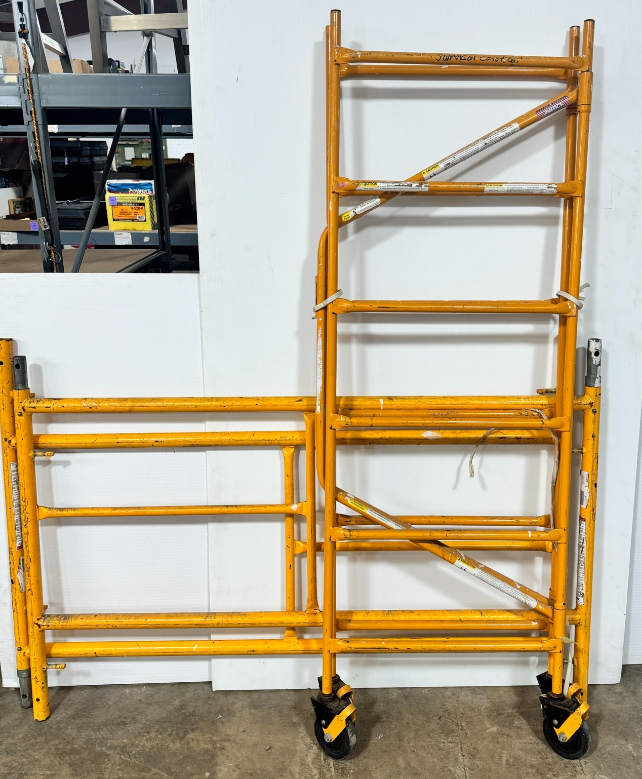 This listing includes a portable scaffolding unit. The scaffolding features an adjustable height, wheels for easy mobility, and a durable frame. The model number is SU-6. Total weight capacity is rated for 600lbs Distributed Load (300 lbs. per platform). 2 uprights 72 x 24 in., 2 side supports 42 x 60 in.