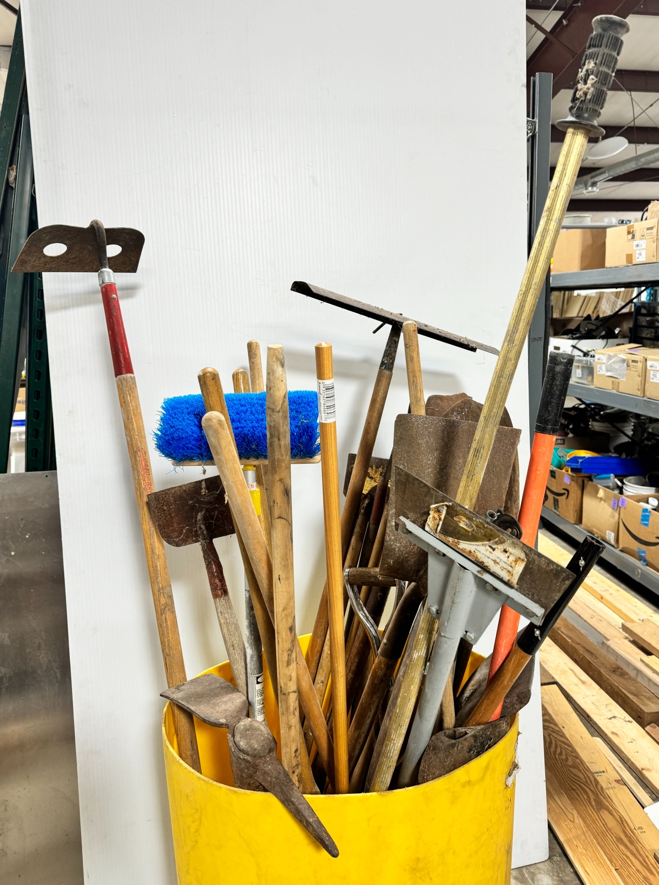A large assortment of garden and other tools in a yellow bucket. Includes shovels, hoes, rakes, picks, and other gardening implements.