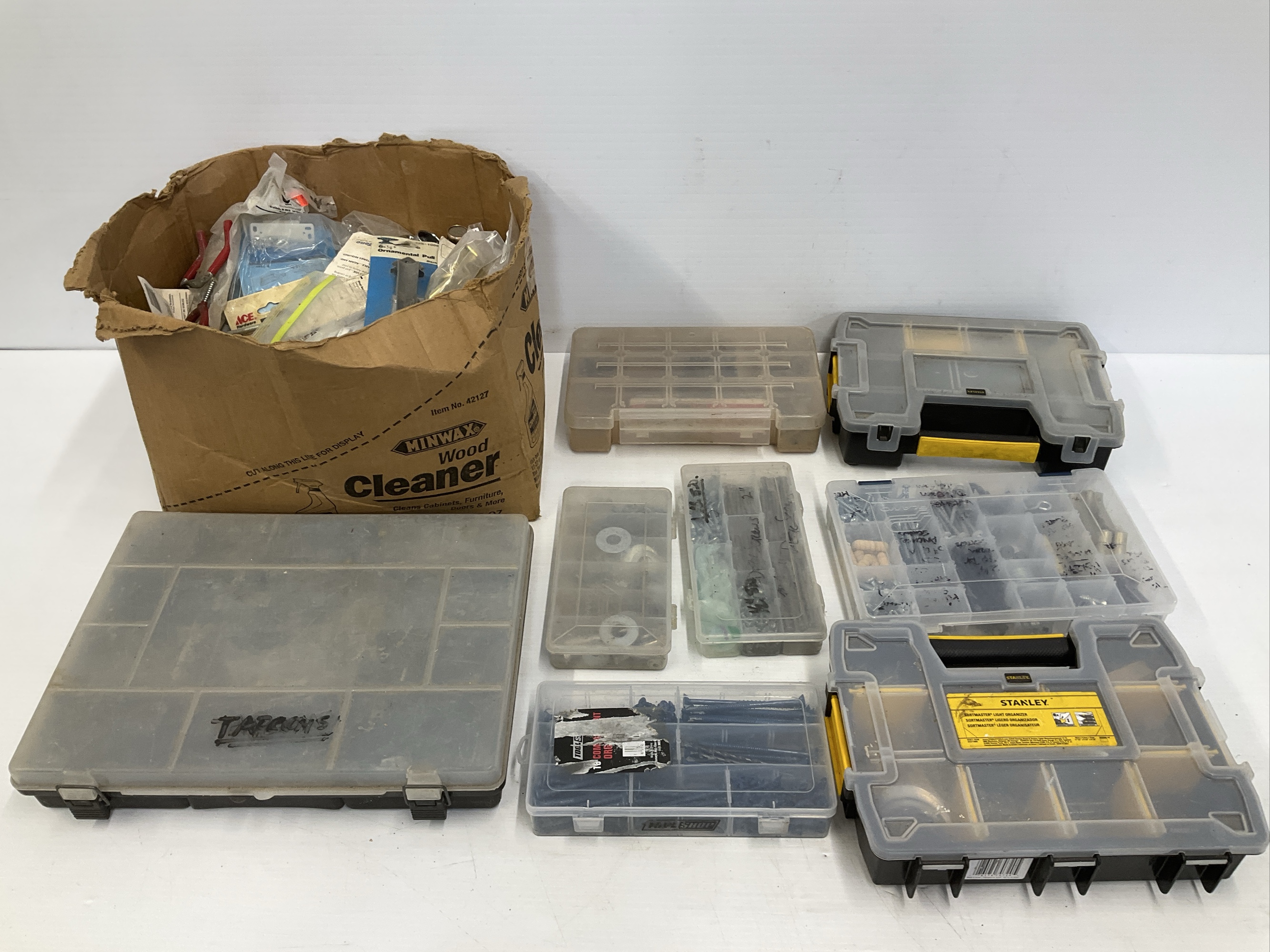 This lot includes a variety of hardware and small parts, such as screws, washers, and fasteners. They are stored in several plastic compartment cases and small parts organizers, including Stanley brand organizers, along with a box filled with various hardware pieces.
