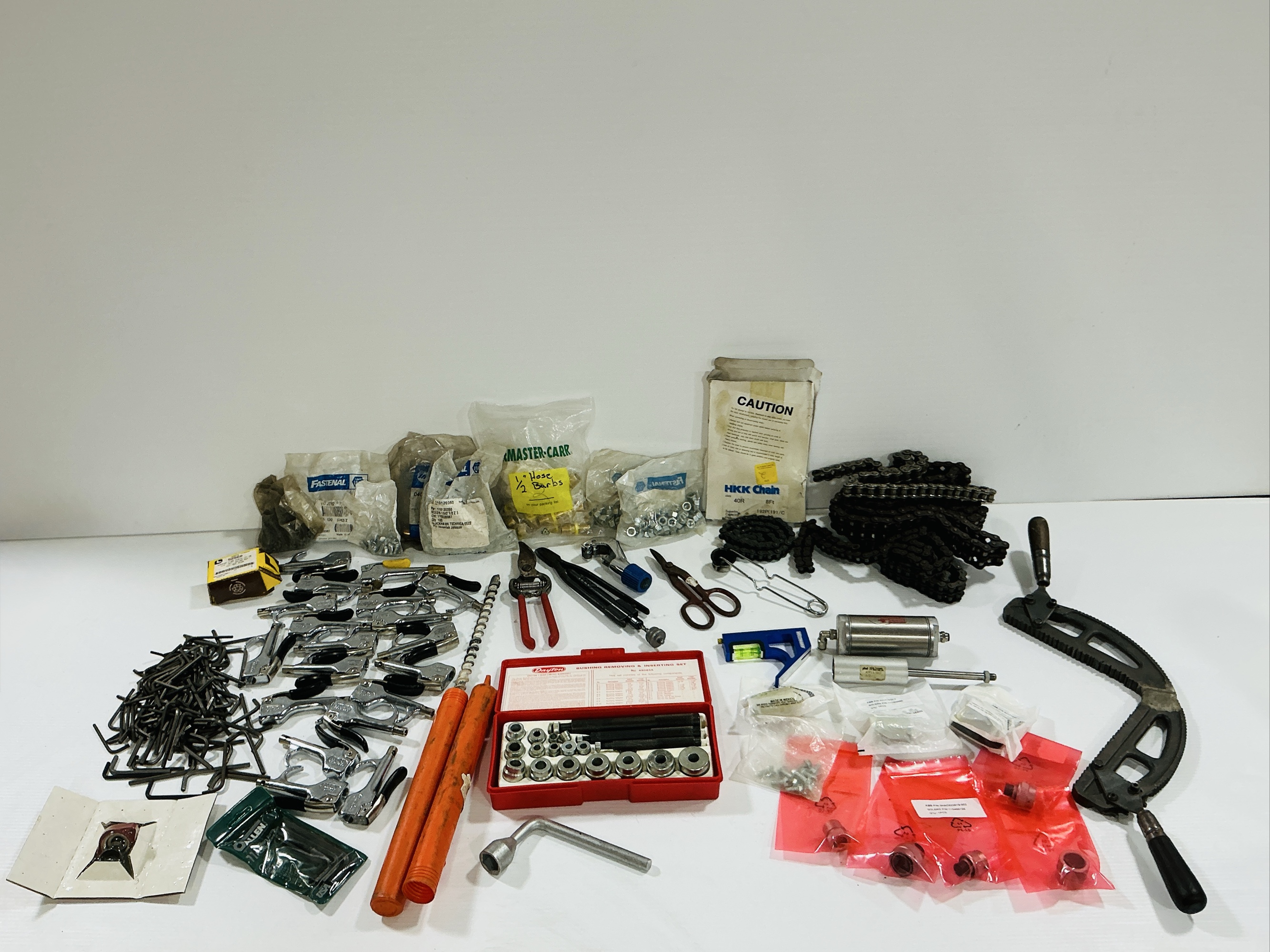 A collection of various tools, parts and hardware. Includes a Dayton bushing removing and inserting set, blow guns, Allen wrenches, valves, HKK chain, and various plumbing and electrical components as shown in the photos.