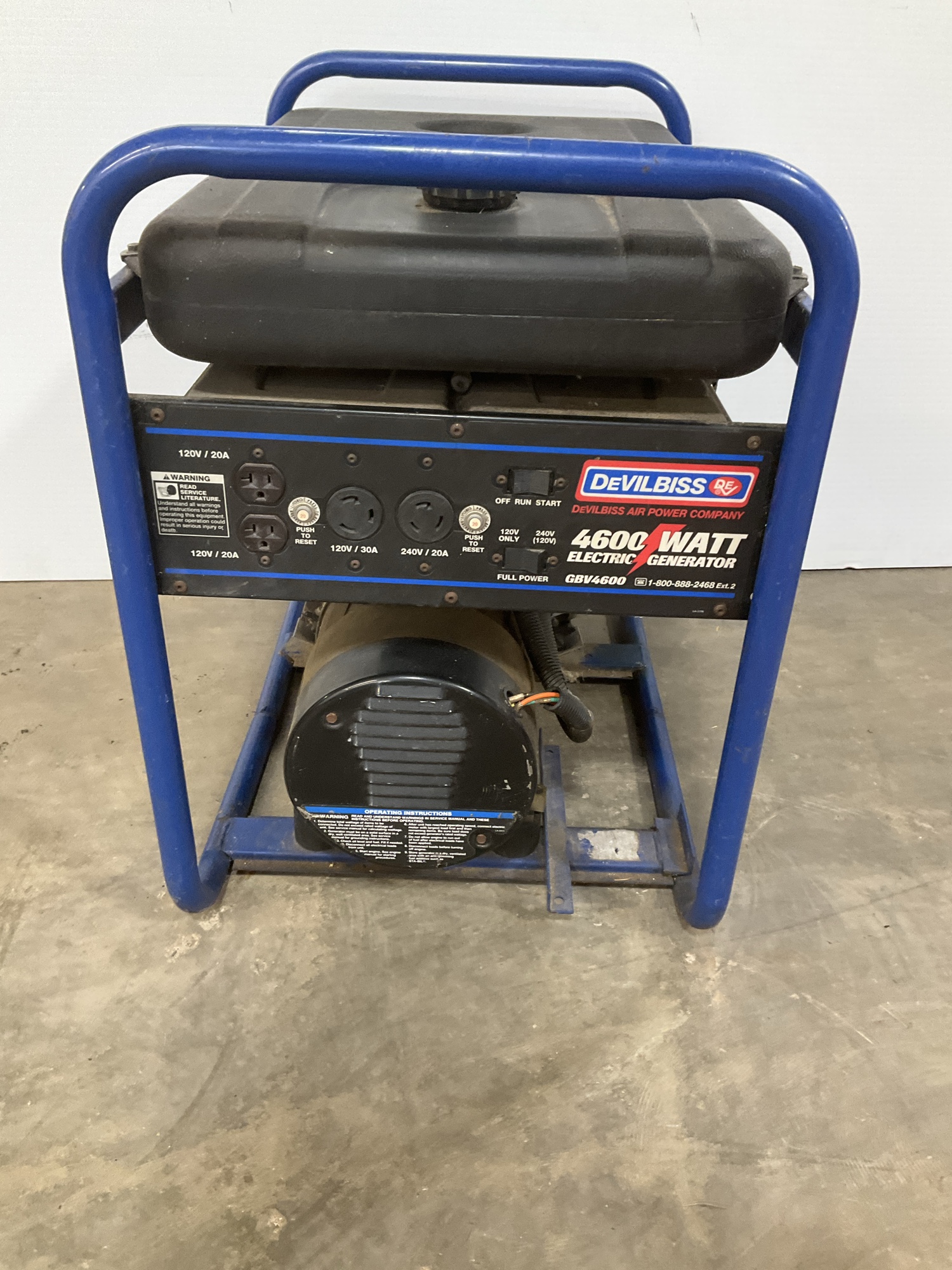 This is a used Devilbiss 4600 Watt Electric Generator. It features a brushless motor, and a blue frame. It appears to be a model GBV4600. Please see photos for details.