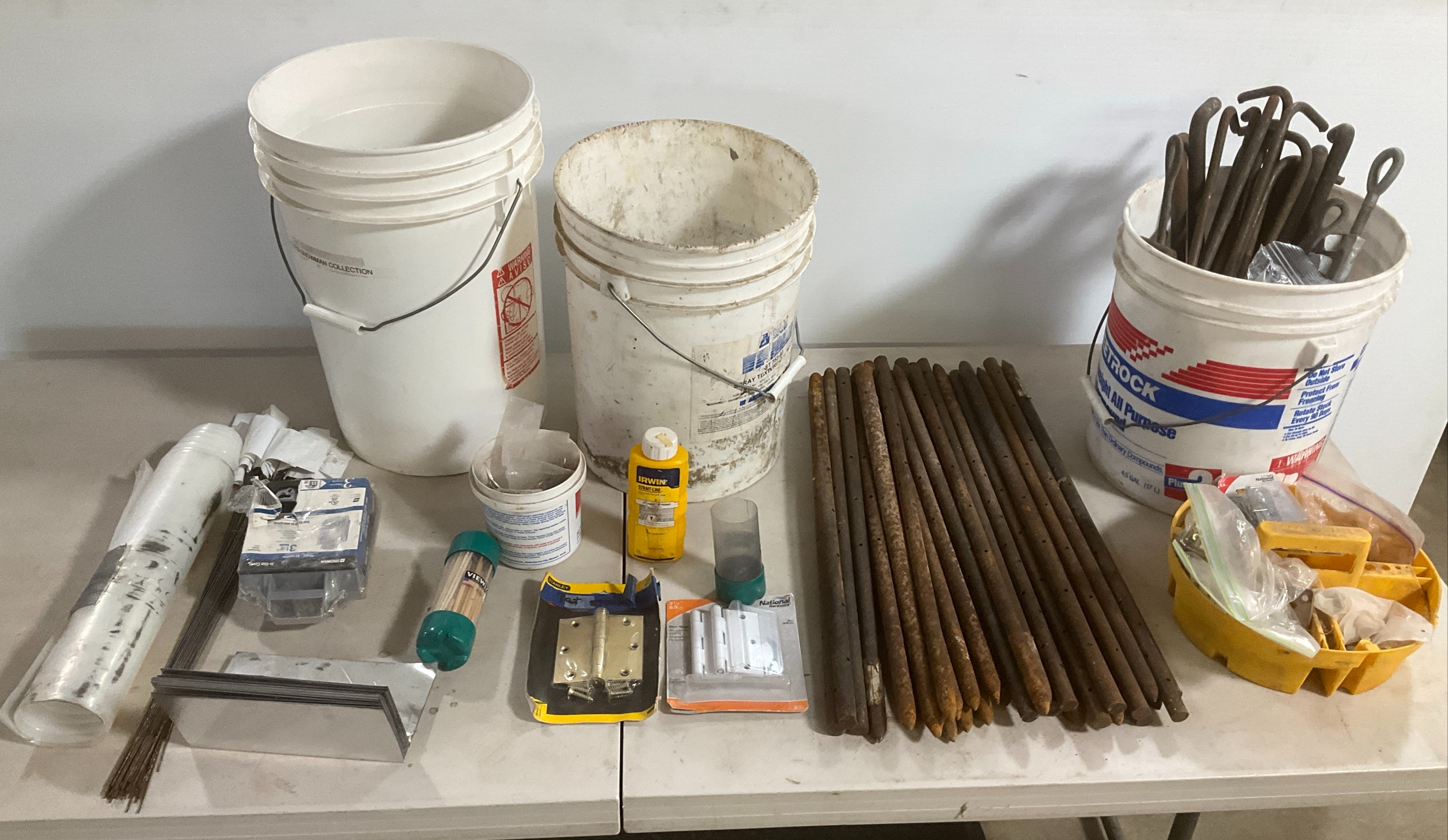 Collection of construction and building materials including metal posts, various hardware components, and other assorted items. Includes buckets of J-bolts and various fence supplies. See photos for details.